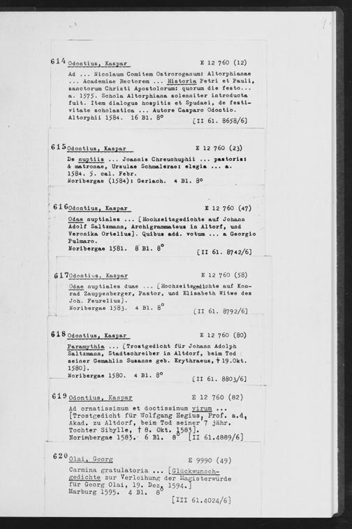 Ad ... Nicolaum Comitem Ostroroganum! Altorphianae ... Academiae Bectorem ... Historia Petri et Pauli, sanctorum Christi Apostolorum; quorum die festo... a. 1575- Schola Altorphiana ßolenniter introducta fuit. Item dialogua hospitis et Spudaei, de feeti- vitate echolaatica ... Autore Casparo Odontio. Altorphii 1584. 16 Bl. 8° [n fil 865Q/6]