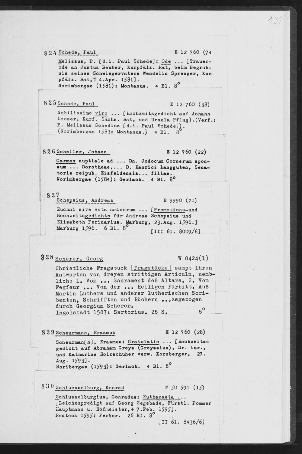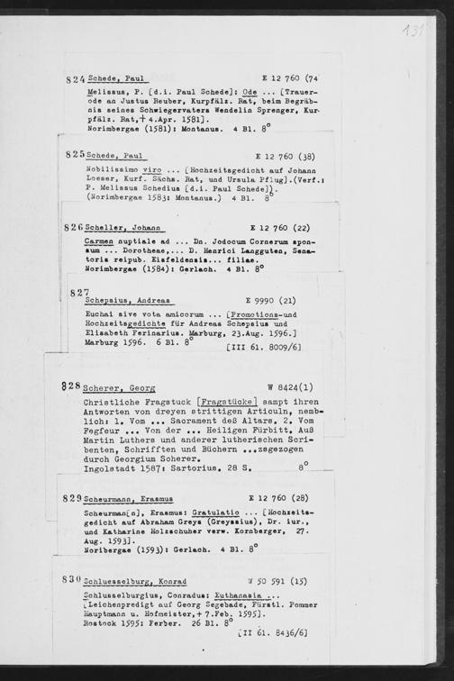 MeliBSus, P. [d.i. Paul Schede]: Ode ... [Trauerode an Justus Beuber, Kurpfälz. Bat, beim Begräbnis seines Schwiegervaters Wendelin Sprenger, Kurpfälz. Rat, -+4. Apr. I58l] . Norimbergae (l58l): MontanuB. 4 Bl. 8