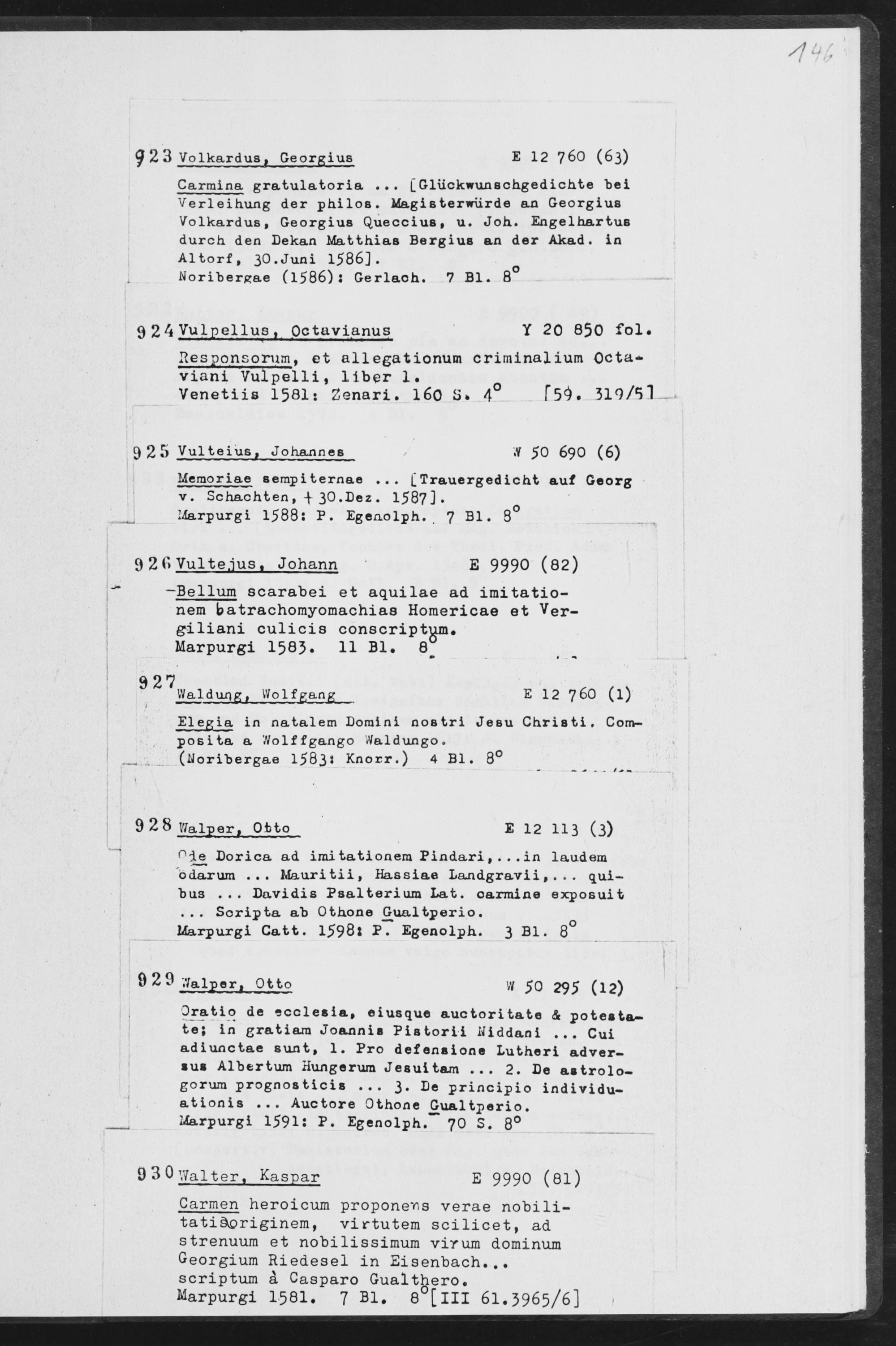 ,n ie Dorica ad imi tationera Pindari , . . . in laudem o darum ... Mauritii, Hassiae Landgravii, . . . qui- bus ... Davidis Psalterium Lat. oarmine exposuit ... Soripta ab Othone Gualtperio. Marpurgi Catt. l598l P. Egenolph. 3 Bl. 8°