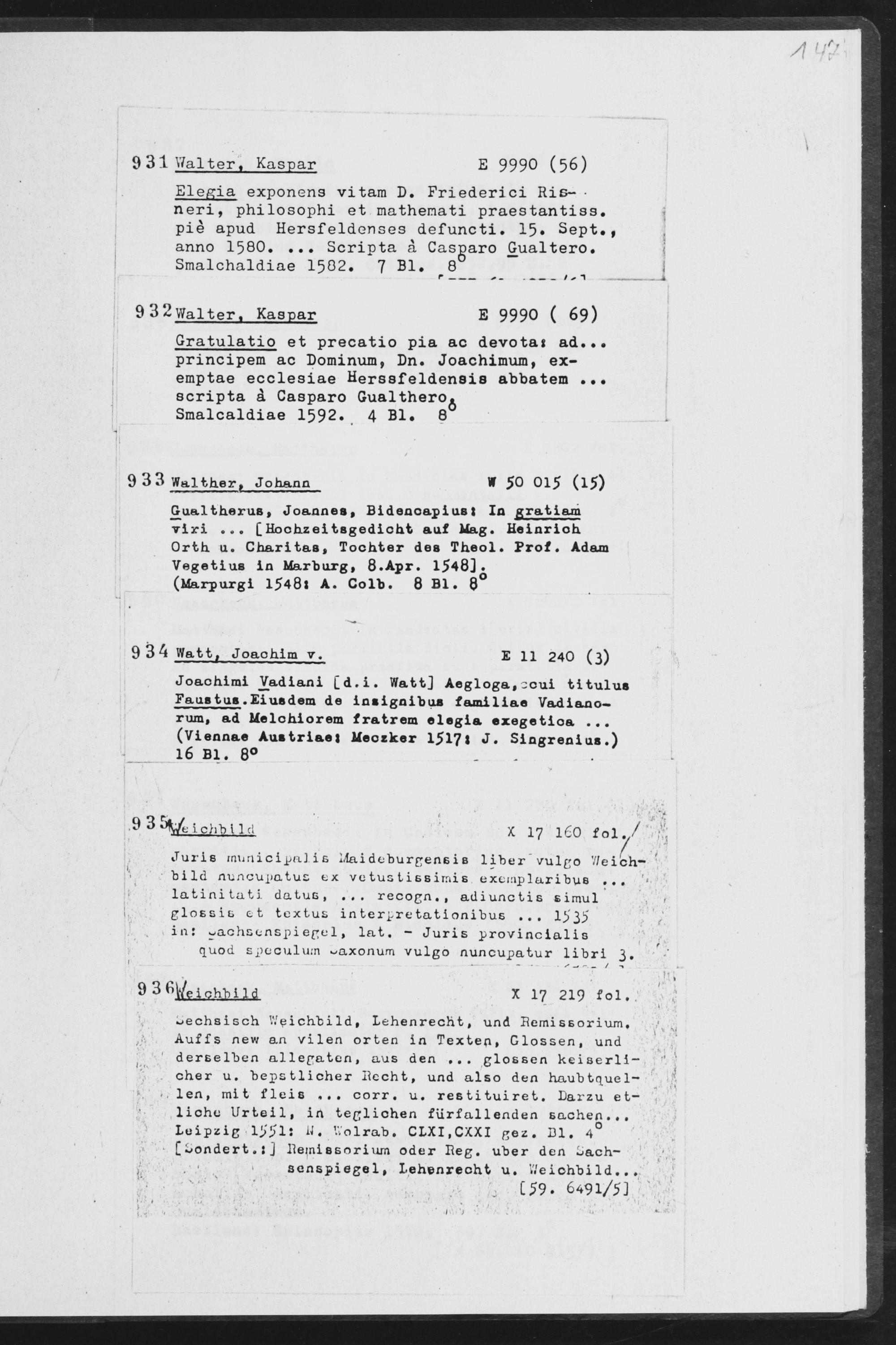 Elegia exponens vitara D. Friederici Rie- ■ neri, philosophi et mathenati praestantiss. pie apud Hersfeldenses defuncti. 15. Sept., anno I58O. ... Scripta ä Caspare- Gualtero. Smalchaldiae 1582. 7 Bl. 8