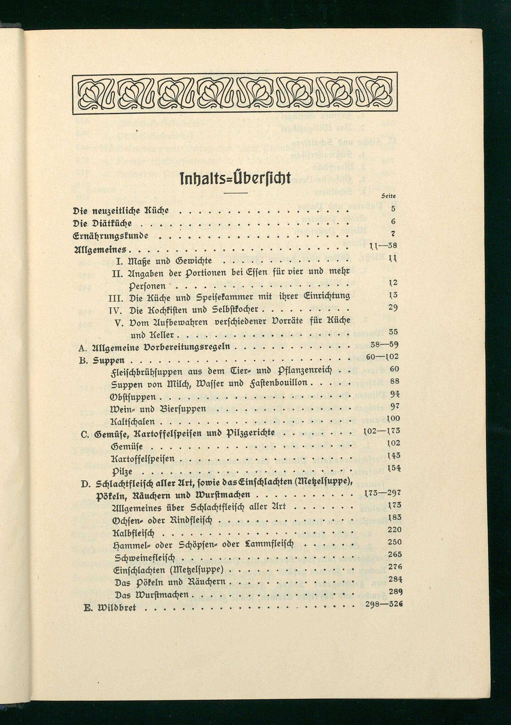 V. Vom Aufbewahren verſchiedener Vorräte für Hüche und Keller................. 35 A. Allgemeine Vorbereitungsregeln............. 38— 59 B. Suppen...................... 60— 102 Fleiſchbrühſuppen aus dem Tier⸗ und Pflanzenreich.. 60 Suppen von Milch, Waſſer und Faſtenbouillon..... 88 Obſtſuppen..................... 94 Wein⸗ und Bierſuppen............... 92 Kaltſchalen..................... 100 C. Gemüſe, Kartoffelſpeiſen und Pilzgerichte........ 102— 123 Gemüſe..................... 102 Kartoffelſpeiſen.................. 145 Pilze....................... 154