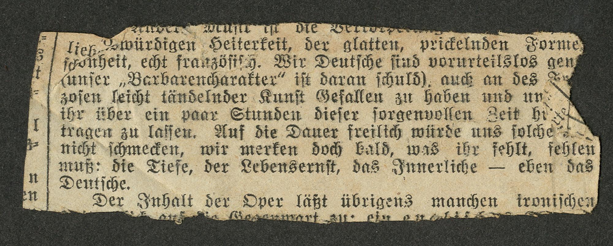 tragen zu laſſen. Auf die Dauer freilich würde uns ſolche nicht ſchmecken, wir merken doch bald, was ihr fehlt, fehlen muß: die Tiefe, der Lebensernſt, das Innerliche— eben das Deutſche. Der ubott der Ober läßt übrigens manchen ironiſchen 4 3 8 8 3—