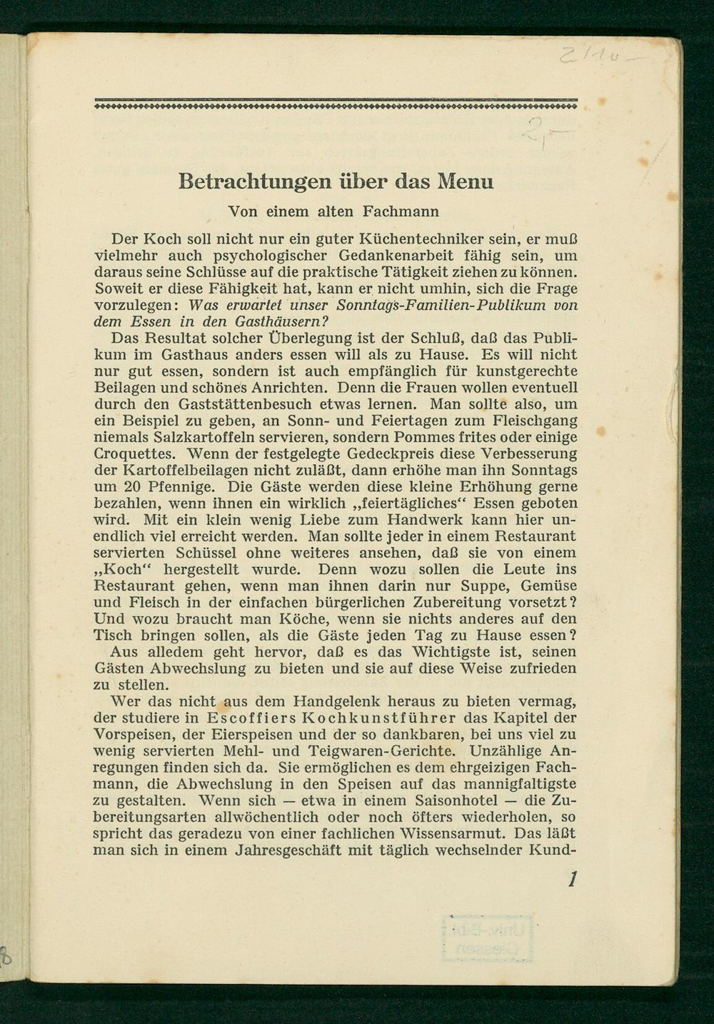 Der Koch soll nicht nur ein guter Küchentechniker sein, er muß vielmehr auch psychologischer Gedankenarbeit fähig sein, um daraus seine Schlüsse auf die praktische Tätigkeit ziehen zu können. Soweit er diese Fähigkeit hat, kann er nicht umhin, sich die Frage vorzulegen: Was erwartet unser Sonntahs-Familien- Publikkum von dem Essen in den Gasthdusern?