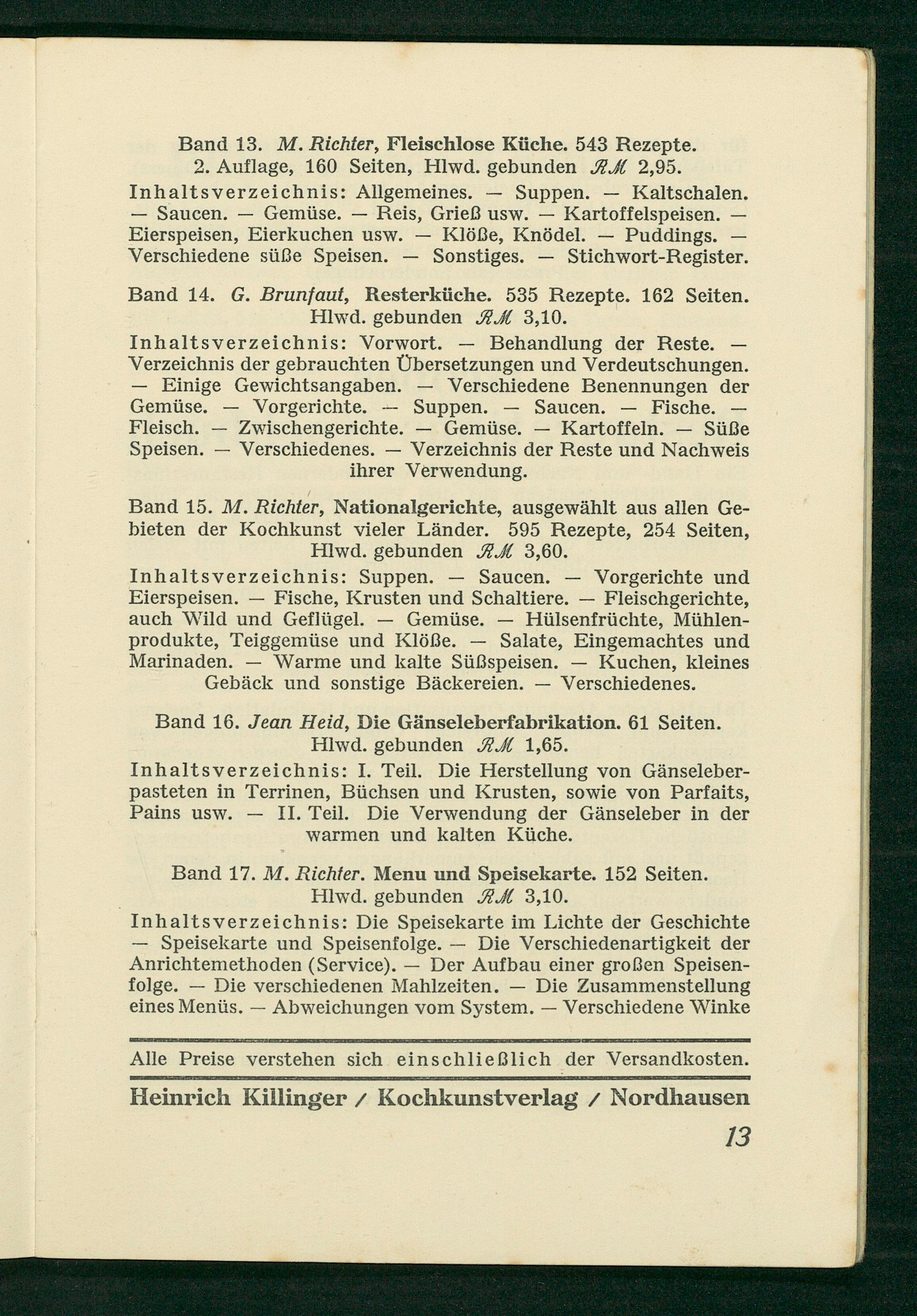 Band 15. M. Richter, Nationalgerichte, ausgewählt aus allen Ge- hbieten der Kochkunst vieler Länder. 595 Rezepte, 254 Seiten, Hlwd. gebunden Nℳ 3,60.