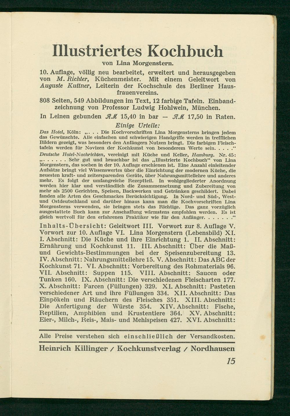 Das Hotel, Köln:„ Die Kochvorschriften Lina Morgensterns pringen jedem das Gewünschte. Alle einfachen und schwierigen Handgriffe werden in trefflichen Bildern gezeigt, was hesonders den Anfängern Nutzen pringt. Die farbigen Fleisch- tafeln werden für Novizen der Kochkunst von besonderem Werte sein.... 3