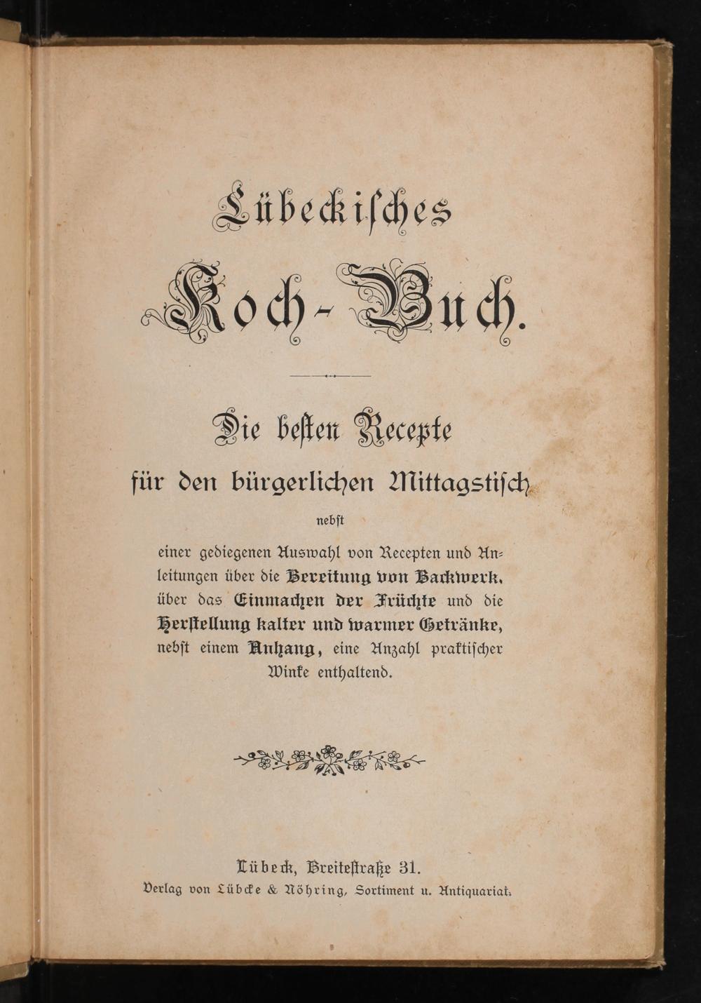 Lübeckisches Koch-Buch. : Die besten Recepte für den bürgerlichen Mittagstisch : nebst einer gediegnen Auswahl von Recepten und Anleitungen über die Bereitung von Backwerk, über das Einmachen der Früchte und die Herstellung kalter und warmer Getränke, nebst einem Anhang, einer Anzahl praktischer Winke enthaltend.