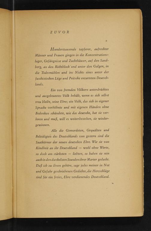 Alle die Gemordeten, Gequälten und Beleidigten des Deutschlands von gestern sind die Saatkörner der neuen deutschen Ehre. Wie sie von Kindheit an ihr Deutschland— wohl ohne Worte, so doch am stärksten— liebten, so haben sie sein auchin den dunkelsten Stunden ihrer Marter gedacht. Daß ich zu ihnen gehöre, sage jedes meiner in Not und Gefahr geschriebenen Gedichte, die Herzschläge