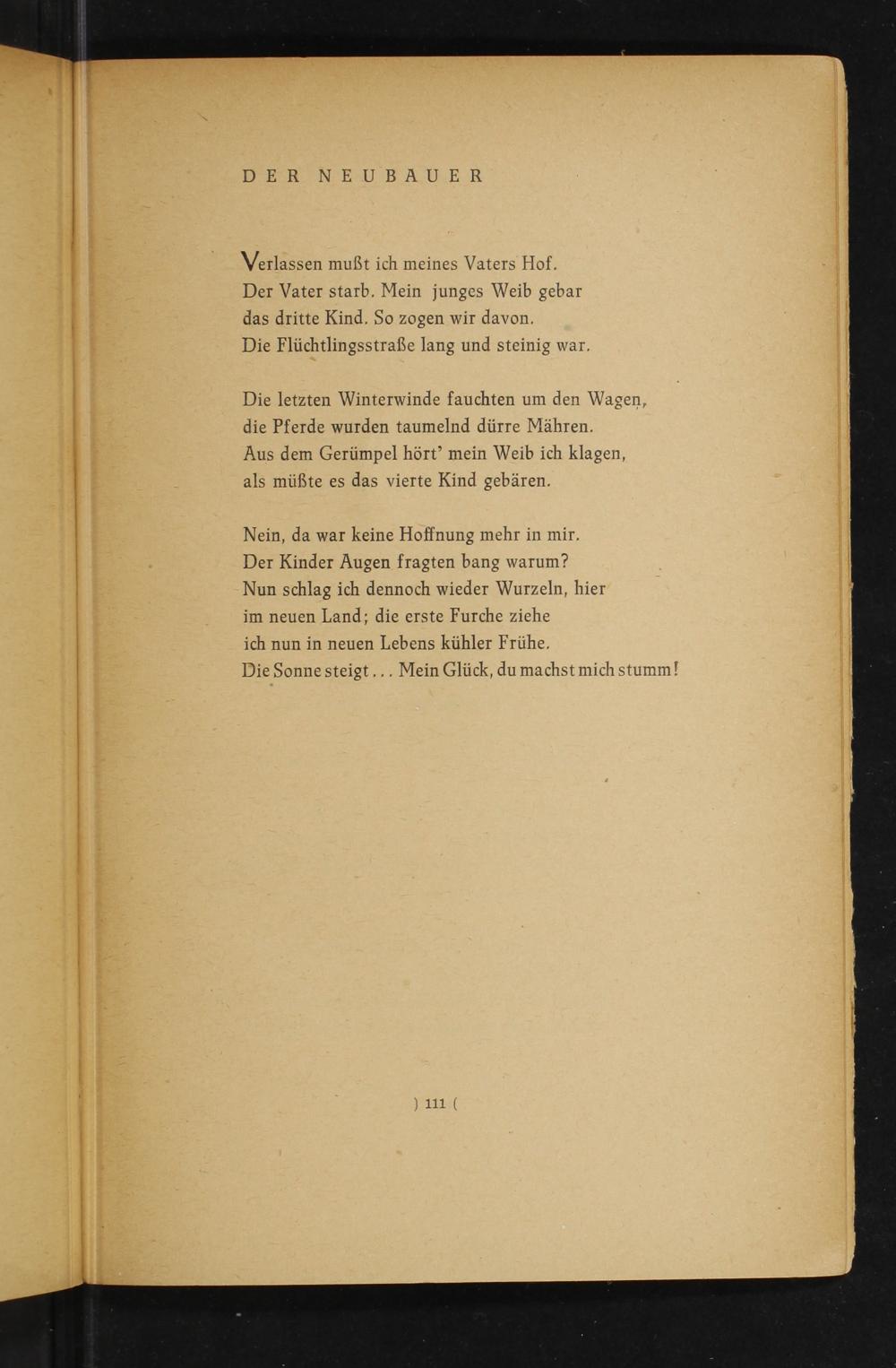 Nein, da war keine Hoffnung mehr in mir. Der Kinder Augen fragten bang warum? Nun schlag ich dennoch wieder Wurzeln, hier im neuen Land; die erste Furche ziehe