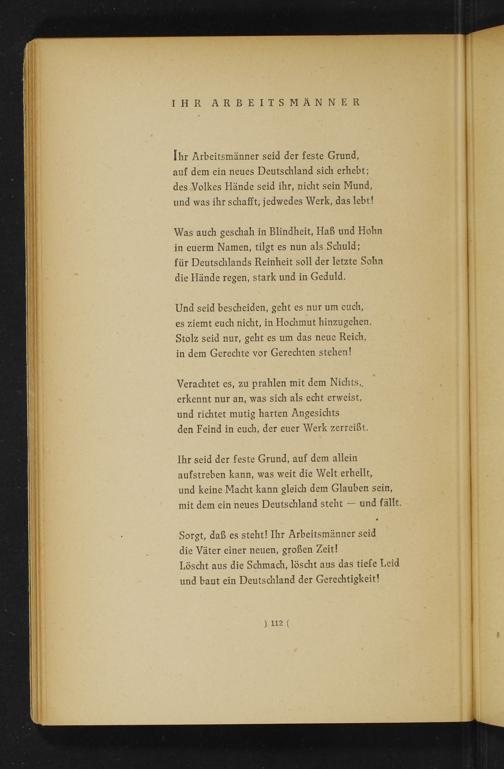 Ihr Arbeitsmänner seid der feste Grund, 1 auf dem ein neues Deutschland sich erhebt; 4 des Volkes Hände seid ihr, nicht sein Mund,| und was ihr schafft; jedwedes Werk, das lebt!