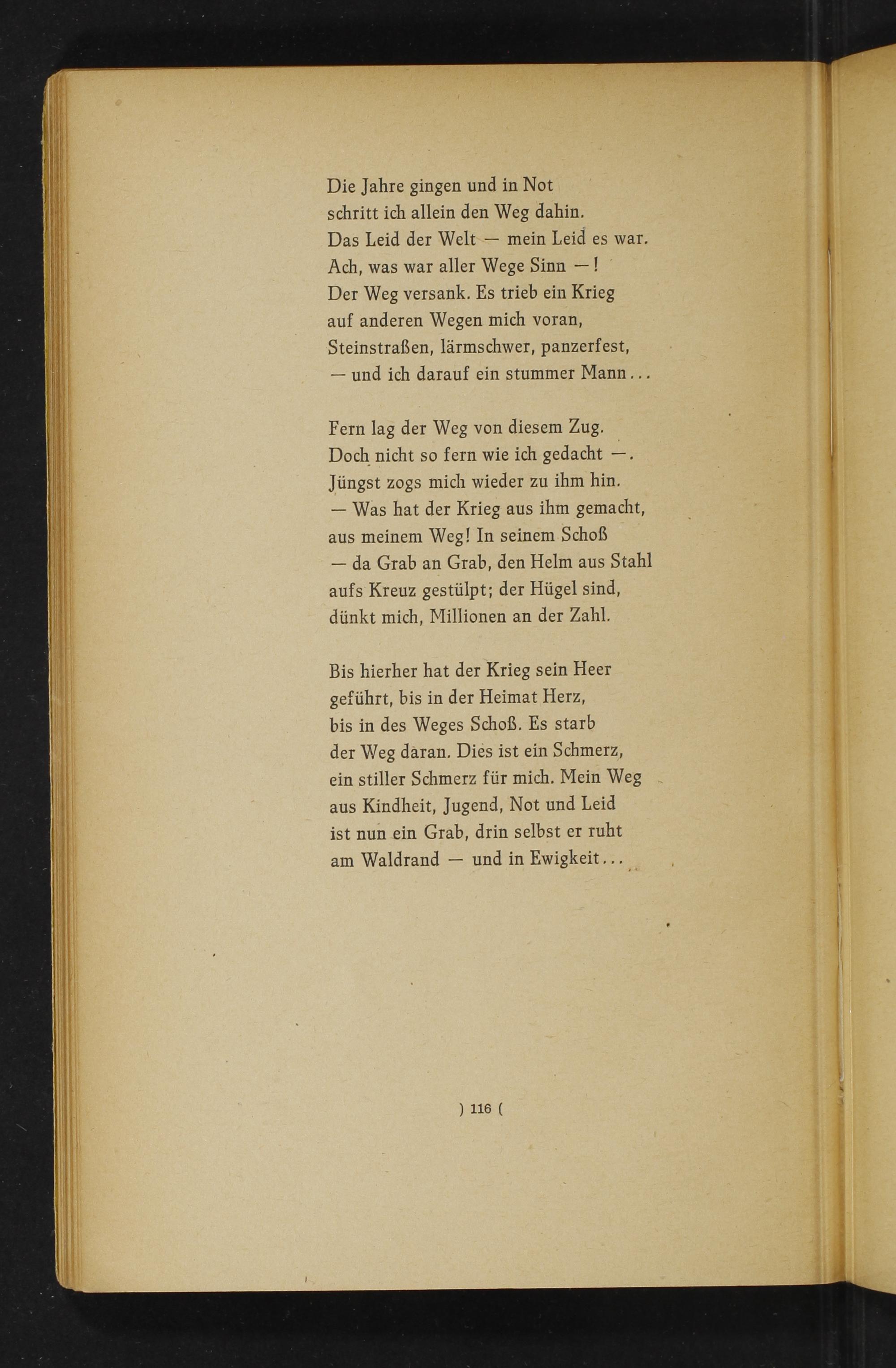 bis in des Weges Schoß. Es starb der Weg daran. Dies ist ein Schmerz, ein stiller Schmerz für mich. Mein Weg aus Kindheit, Jugend, Not und Leid ist nun ein Grab, drin selbst er ruht am Waldrand— und in Ewigkeit...