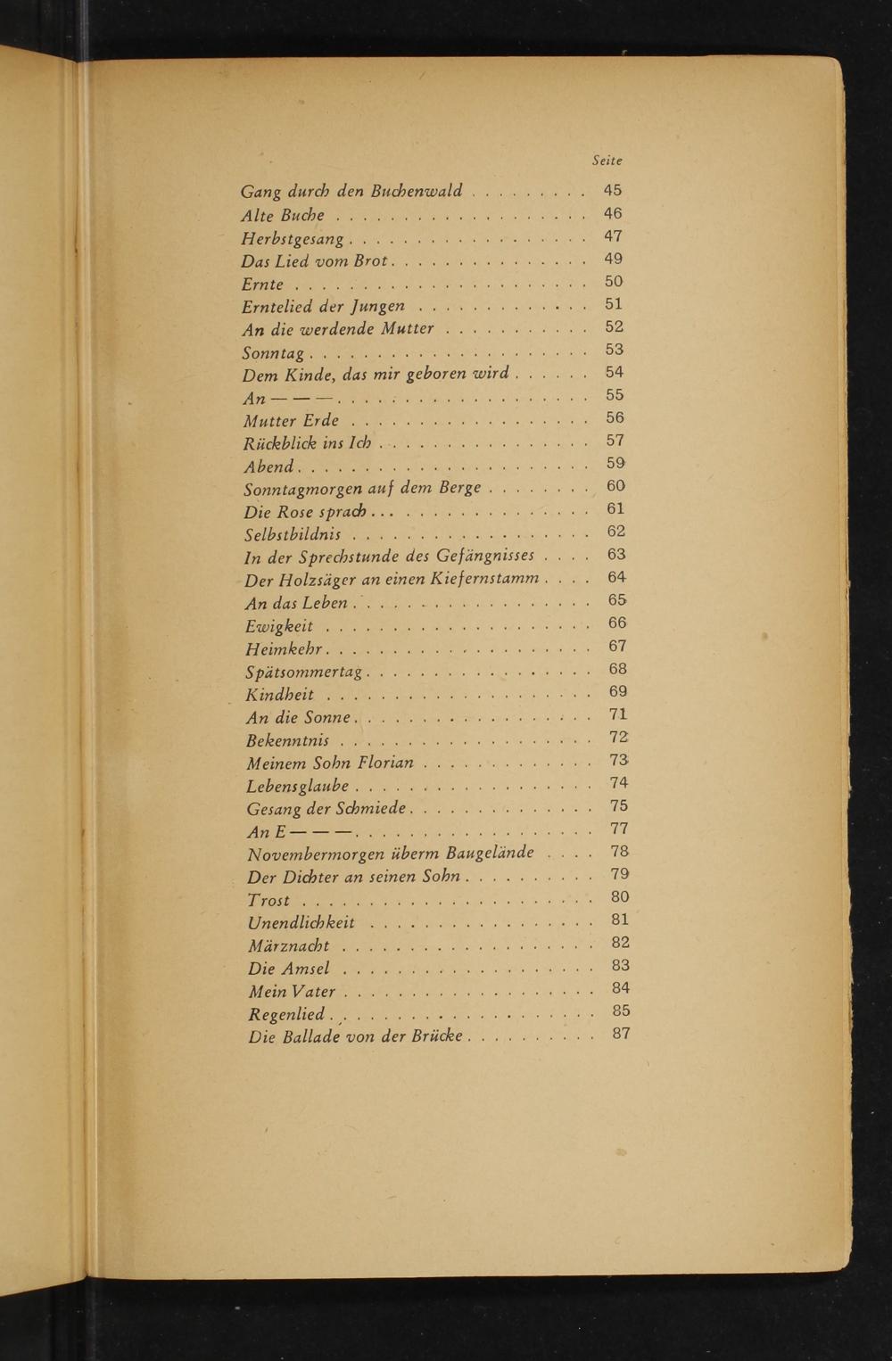 Ally Baches le ee 46 lerpsipesame 0. nenn. 47 Dias. ae) lo re een 49 Bea eine 50 Ermtehed der Jungen»... 2... 51 An die werdende Mutter.......:....- 52 Somnizen ver eenoee 53 Dem Kinde, das mir geboren wird....... 54 a ee 55 Imker oralen a ee 56 RAN 20 ae ee 57 Alain Se ee 59 Sonntagmorgen auf dem Berge.......- 60 DnerRosesprach una ne: 61 Sellbaulldhaige sn a: 62