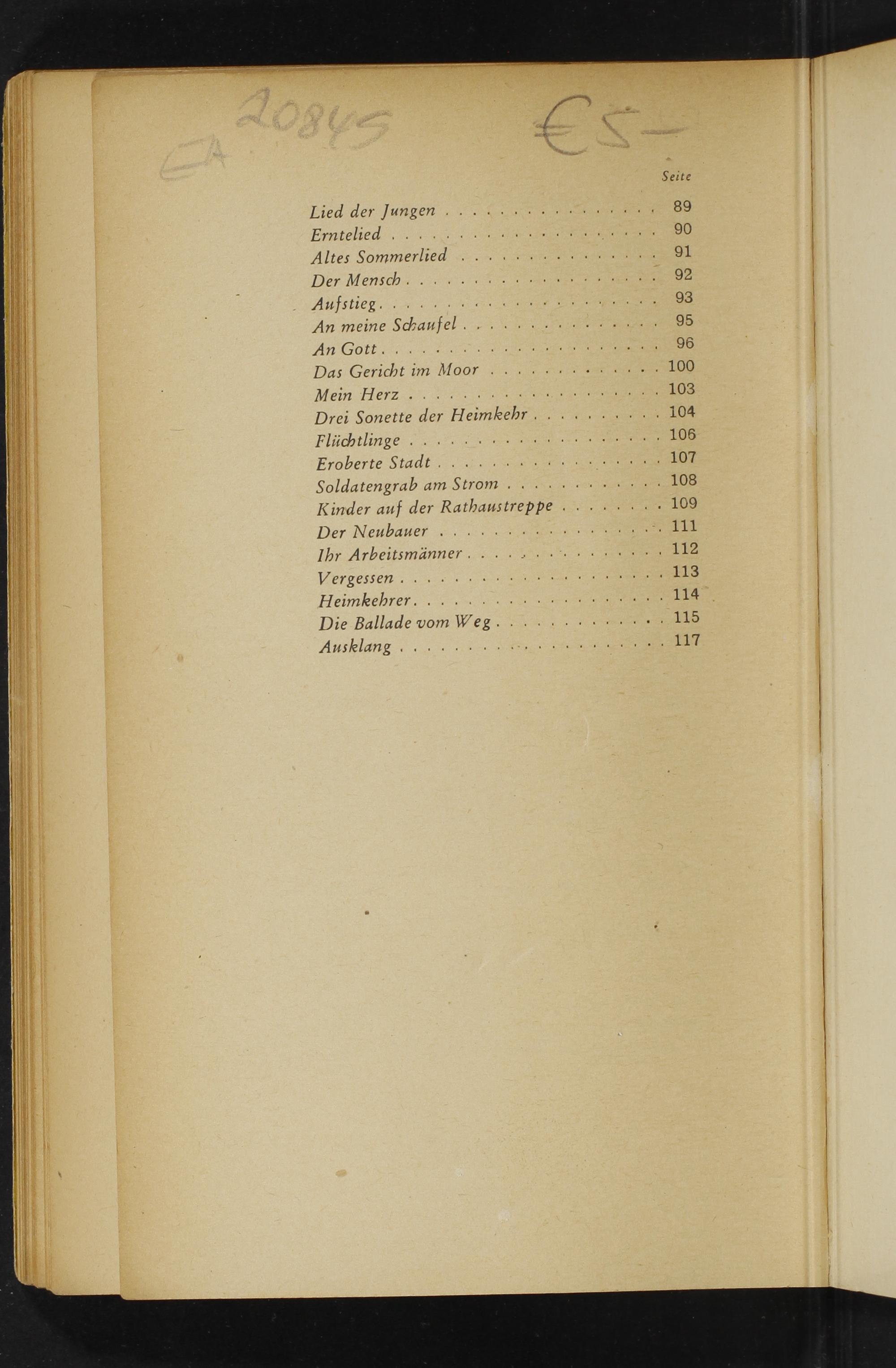 Drei Sonette der Heimkehr.......... 104| Flüchtlinge... Sn a 106 Eroberte Stadt... uno. no 107| Soldatengrab amStrom........ rc:.: 108| Kinder auf der Rathaustreppe.....:.- 109