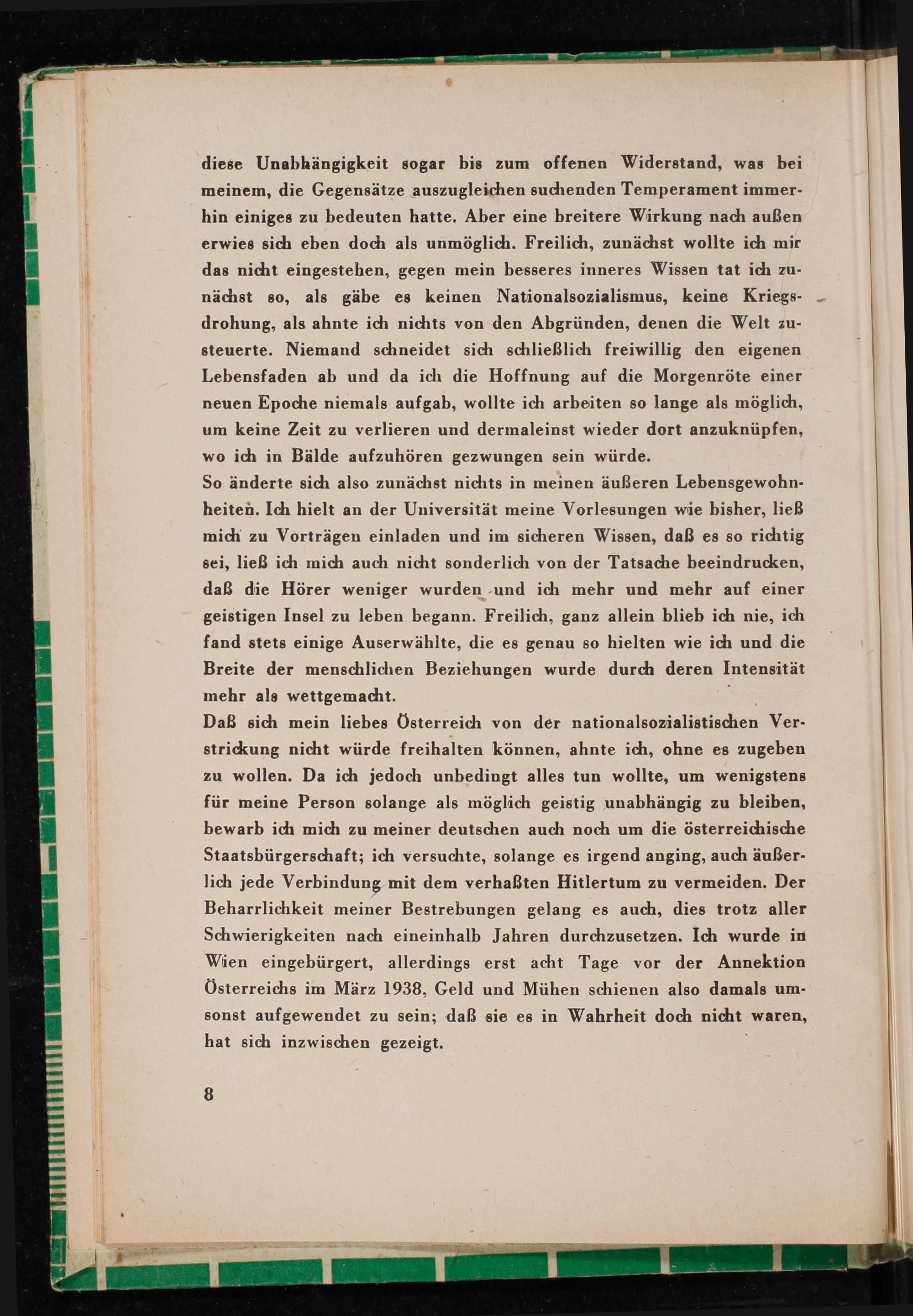 Daß sich mein liebes Österreich von der nationalsozialistischen Ver- strickung nicht würde freihalten können, ahnte ich, ohne es zugeben zu wollen. Da ich jedoch unbedingt alles tun wollte, um wenigstens für meine Person solange als möglich geistig unabhängig zu bleiben, bewarb idı mich zu meiner deutschen auch noch um die österreichische Staatsbürgerschaft; ich versuchte, solange es irgend anging, auch äußer- lich jede Verbindung mit dem verhaßten Hitlertum zu vermeiden. Der Beharrlichkeit meiner Bestrebungen gelang es auch, dies trotz aller Schwierigkeiten nach eineinhalb Jahren durchzusetzen. Ich wurde in Wien eingebürgert, allerdings erst acht Tage vor der Annektion Österreichs im März 1938, Geld und Mühen schienen also damals um- sonst aufgewendet zu sein; daß sie es in Wahrheit doch nicht waren, hat sich inzwischen gezeigt.