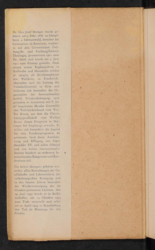Dr. Max Josef Metzger wurd- boren am 3. Febr. 1887 zu Schopf heim i. Schwarzwald, besuchte da Gymnasium in Konstanz, studier-
