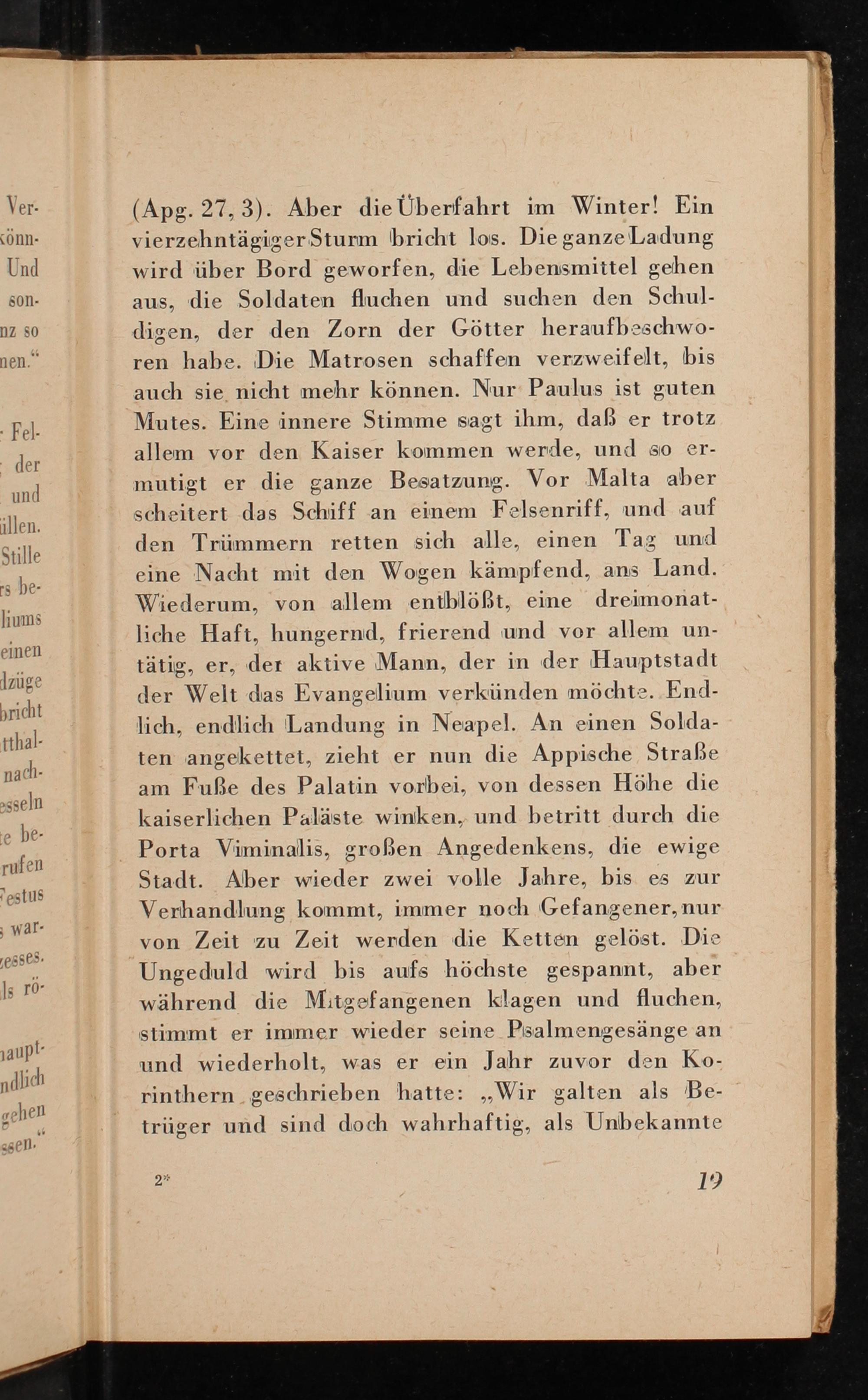 (Apg. 27,3). Aber dieÜuberfahrt im Winter! Ein vierzehntägigerSturm bricht los. Dieganze Ladung wird über Bord geworfen, die Lebensmittel gehen aus, die Soldaten fluchen und suchen den Schul- digen, der den Zorn der Götter heraufbeschwo- ren habe. Die Matrosen schaffen verzweifelt, bis auch sie nicht mehr können. Nur Paulus ist guten Mutes. Eine innere Stimme sagt ihm, daß er trotz allem vor den Kaiser kommen werde, und so er- mutigt er die ganze Besatzung. Vor Malta aber scheitert das Schiff an einem Felsenriff, und auf den Trümmern retten sich alle, einen Tag und eine Nacht mit den Wogen kämpfend, ans Land. Wiederum, von allem entblößt, eine dreimonat- liche Haft, hungernd, frierend und vor allem un- tätig, er, der aktive Mann, der in der Hauptstadt der Welt das Evangelium verkünden möchte. End- lich, endlich Landung in Neapel. An einen Solda- ten angekettet, zieht er nun die Appische Straße am Fuße des Palatin vorbei, von dessen Höhe die kaiserlichen Paläste winken, und betritt durch die Porta Viminalis, großen Angedenkens, die ewige Stadt. Aber wieder zwei volle Jahre, bis es zur Verhandlung kommt, immer noch Gefangener, nur von Zeit zu Zeit werden die Ketten gelöst. Die Ungeduld wird bis aufs höchste gespannt, aber während die Mitgefangenen klagen und fluchen, stimmt er immer wieder seine Psalmengesänge an und wiederholt, was er ein Jahr zuvor den Ko- rinthern geschrieben hatte:„Wir galten als Be- trüger und sind doch wahrhaftig, als Unbekannte