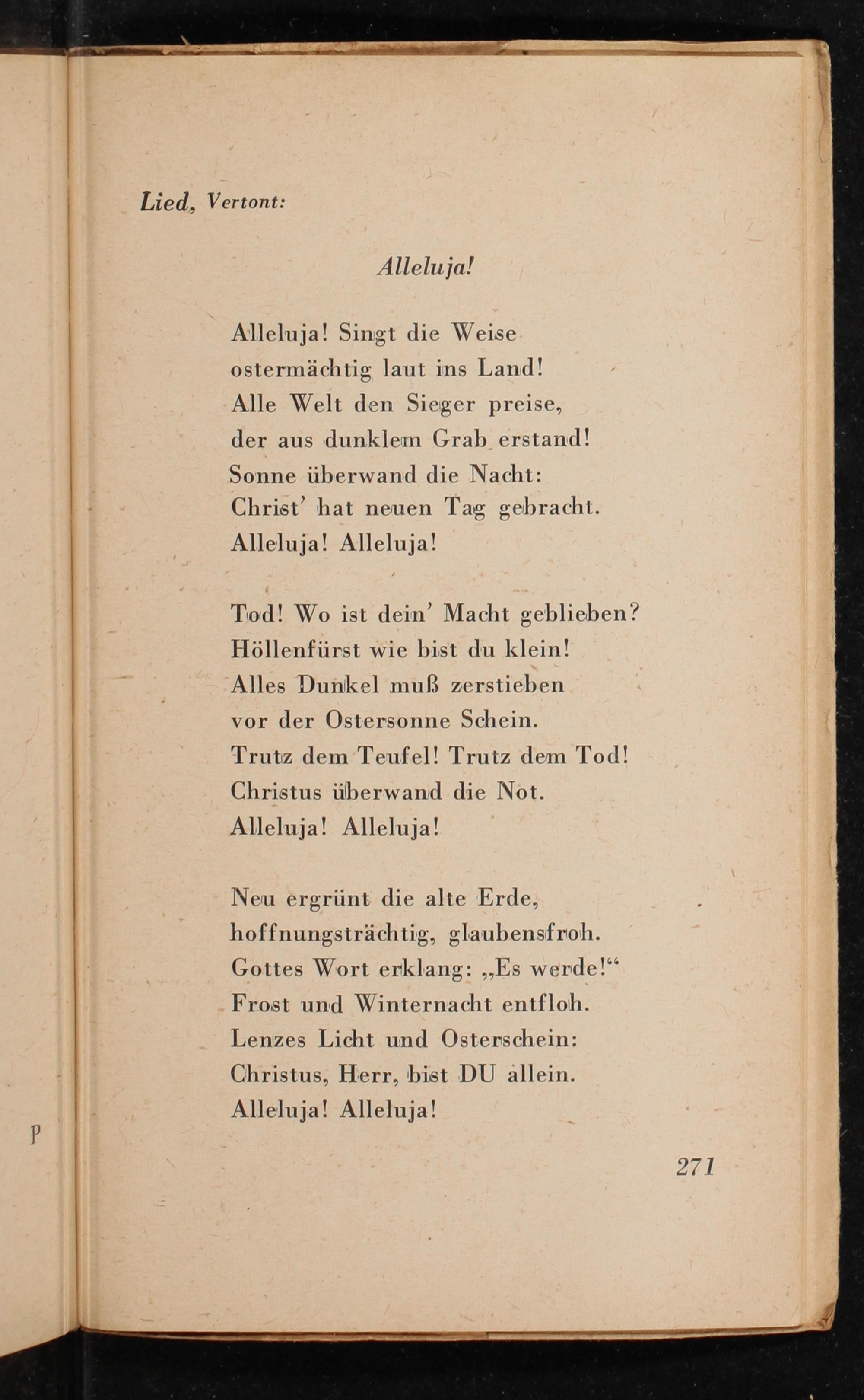 Alleluja! Singt die Weise ostermächtig laut ins Land! Alle Welt den Sieger preise, der aus dunklem Grab erstand! Sonne überwand die Nacht: Christ’ hat neuen Tag gebracht.