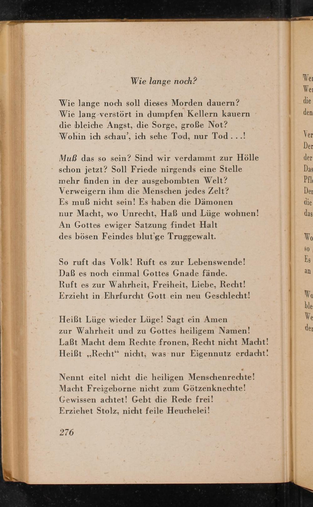 Wie lange noch soll dieses Morden dauern? Wie lang-verstört in dumpfen Kellern kauern die bleiche Angst, die Sorge, große Not? Wohin ich schau’, ich sehe Tod, nur Tod...!