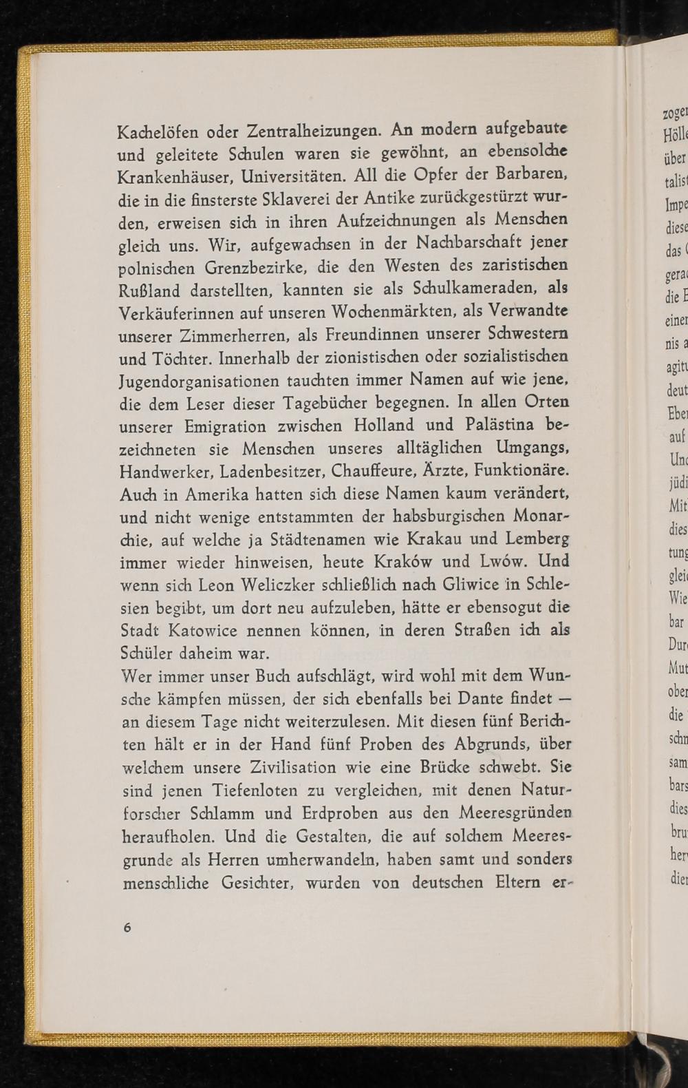 Kachelöfen oder Zentralheizungen. An modern aufgebaute und geleitete Schulen waren sie gewöhnt, an ebensolche Krankenhäuser, Universitäten. All die Opfer der Barbaren, die in die finsterste Sklaverei der Antike zurückgestürzt wur- den, erweisen sich in ihren Aufzeichnungen als Menschen gleich uns. Wir, aufgewachsen in der Nachbarschaft jener polnischen Grenzbezirke, die den Westen des zaristischen Rußland darstellten, kannten sie als Schulkameraden, als Verkäuferinnen auf unseren Wochenmärkten, als Verwandte unserer Zimmerherren, als Freundinnen unserer Schwestern und Töchter. Innerhalb der zionistischen oder sozialistischen Jugendorganisationen tauchten immer Namen auf wie jene, die dem Leser dieser Tagebücher begegnen. In allen Orten unserer Emigration zwischen Holland und Palästina be- zeichneten sie Menschen unseres alltäglichen Umgangs, Handwerker, Ladenbesitzer, Chauffeure, Ärzte, Funktionäre. Auc in Amerika hatten sich diese Namen kaum verändert, und nicht wenige entstammten der habsburgischen Monar- chie, auf welche ja Städtenamen wie Krakau und Lemberg immer wieder hinweisen, heute Kraköw und Lwöw. Und wenn sich Leon Weliczker schließlich nach Gliwice in Schle- sien begibt, um dort neu aufzuleben, hätte er ebensogut die Stadt Katowice nennen können, in deren Straßen ich als Schüler daheim war.
