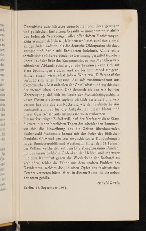Oberschicht aufs härteste ausgebeutet und ihrer geistigen und politischen Entfaltung beraubt— immer unter Mithilfe von Juden als Werkzeugen aller öffentlichen Einrichtungen. Kein Wunder, daß diese„Kleinrussen“ sich zunächst einmal an den Juden rächten, als die deutsche Okkupation sie dazu anregte und dafür mit Brotkarten belohnte. Ohne echte sozialistische völkerverbindende Gesinnung gestaltet sich eben überall auf der Erde das Zusammenleben von Menschen ver- schiedener Abkunft schwierig; jede Tyrannei kann sich auf diese Spannungen stützen und sie bis zum Mord steigern. Hinter einem wissenschaftlichen Wort wie Differenzaffekt verbirgt sich jenes Dynamit, das sich zusammenbraut aus ökonomischen Bestandteilen der Gesellschaft und psychischen der menschlichen Natur. Und dennoch bleiben wir bei der Überzeugung, daß sich im Laufe der Menschheitsgeschichte unser Wesen als homo sapiens wirklich verfeinert und ver- bessert hat und daß ein Rücksturz wie der faschistische uns wachzurütteln hat für die Aufgabe, an dieser Natur und dieser Gesellschaft aufs intensivste weiterzuformen. Ein merkwürdiger Zufall will, daß der Verfasser diese Sätze diktiert in jenen herrlichen Tagen des scheidenden Sommers, wo sich die Einweihung des die Zeiten überdauernden Buchenwald-Mahnmals kreuzt mit der Feier des jüdischen Neujahrs 5719 und gewisser revanchistischer Kundgebungen in der Bundesrepublik und Westberlin. Unter den 21 Fahnen der Völker, welche sich auf dem Ettersberg zusammenfanden, um das unauslöschliche Gedenken der Helden und Märtyrer mit dem Kampfruf gegen die Wiederkehr der Barbarei zu verbinden, fehlte die Fahne mit dem uralten Emblem des Davidsterns, welches die jüdischen Opfer des faschistischen Terrors vertreten hätte. Hier, in diesem Buche, ist sie neben der roten gehißt.