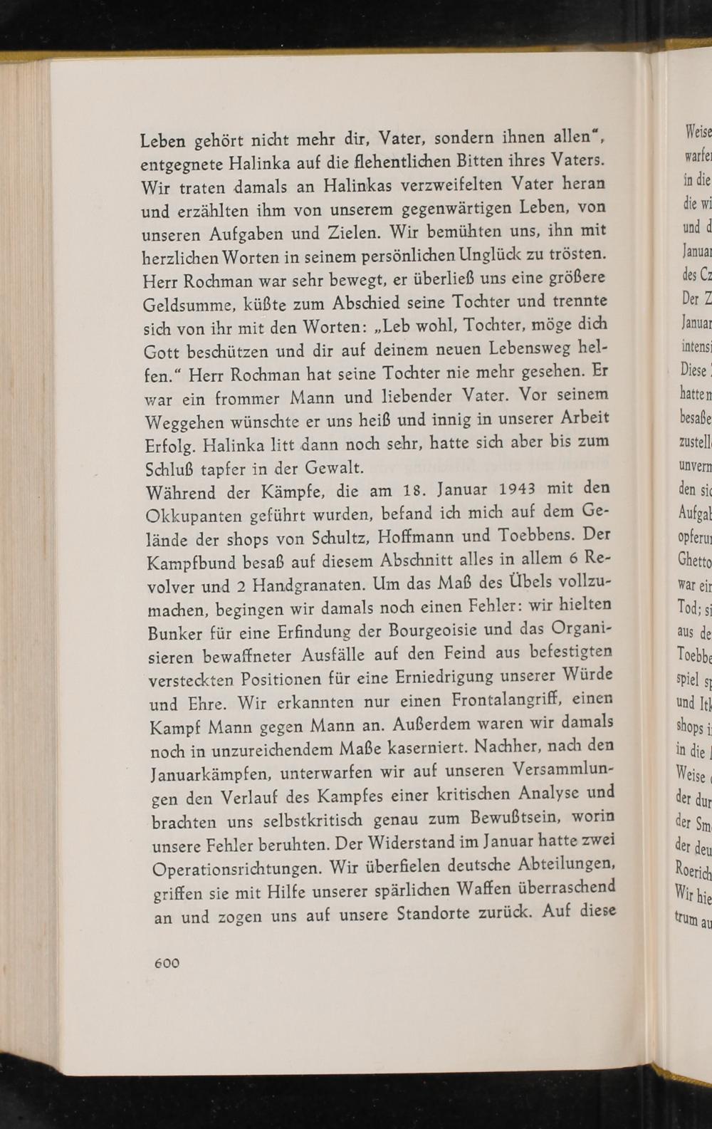 Leben gehört nicht mehr dir, Vater, sondern ihnen allen“, entgegnete Halinka auf die flehentlichen Bitten ihres Vaters. Wir traten damals an Halinkas verzweifelten Vater heran und erzählten ihm von unserem gegenwärtigen Leben, von unseren Aufgaben und Zielen. Wir bemühten uns, ihn mit herzlichen Worten in seinem persönlichen Unglück zu trösten. Herr Rochman war sehr bewegt, er überließ uns eine größere Geldsumme, küßte zum Abschied seine Tochter und trennte sich von ihr mit den Worten:„Leb wohl, Tochter, möge dich Gott beschützen und dir auf deinem neuen Lebensweg hel- fen.“ Herr Rochman hat seine Tochter nie mehr gesehen. Er war ein frommer Mann und liebender Vater. Vor seinem Weggehen wünschte er uns heiß und innig in unserer Arbeit Erfolg. Halinka litt dann noch sehr, hatte sich aber bis zum Schluß tapfer in der Gewalt. Während der Kämpfe, die am 18. Januar 1943 mit den Okkupanten geführt wurden, befand ich mich auf dem Ge- lände der shops von Schultz, Hoffmann und Toebbens. Der Kampfbund besaß auf diesem Abschnitt alles in allem 6 Re- volver und 2 Handgranaten. Um das Maß des Übels vollzu- machen, begingen wir damals noch einen Fehler: wir hielten Bunker für eine Erfindung der Bourgeoisie und das Organi- sieren bewaffneter Ausfälle auf den Feind aus befestigten versteckten Positionen für eine Erniedrigung unserer Würde und Ehre. Wir erkannten nur einen Frontalangriff, einen Kampf Mann gegen Mann an. Außerdem waren wir damals noch in unzureichendem Maße kaserniert. Nachher, nach den Januarkämpfen, unterwarfen wir auf unseren Versammlun- gen den Verlauf des Kampfes einer kritischen Analyse und brachten uns selbstkritisch genau zum Bewußtsein, worin unsere Fehler beruhten. Der Widerstand im Januar hatte zwei Operationsrichtungen. Wir überfielen deutsche Abteilungen, griffen sie mit Hilfe unserer spärlichen Waffen überraschend an und zogen uns auf unsere Standorte zurück. Auf diese