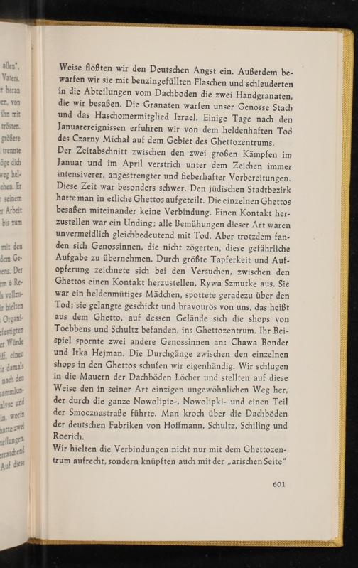 Der Zeitabschnitt zwischen den zwei großen Kämpfen im Januar und im April verstrich unter dem Zeichen immer intensiverer, angestrengter und fieberhafter Vorbereitungen. Diese Zeit war besonders schwer. Den jüdischen Stadtbezirk hatteman in etliche Ghettos aufgeteilt. Die einzelnen Ghettos besaßen miteinander keine Verbindung. Einen Kontakt her- zustellen war ein Unding; alle Bemühungen dieser Art waren unvermeidlich gleichbedeutend mit Tod. Aber trotzdem fan- den sich Genossinnen, die nicht zögerten, diese gefährliche Aufgabe zu übernehmen. Durch größte Tapferkeit und Auf- opferung zeichnete sich bei den Versuchen, zwischen den Ghettos einen Kontakt herzustellen, Rywa Szmutke aus. Sie war ein heldenmütiges Mädchen, spottete geradezu über den Tod; sie gelangte geschickt und bravourös von uns, das heißt aus dem Ghetto, auf dessen Gelände sich die shops von Toebbens und Schultz befanden, ins Ghettozentrum. Ihr Bei- spiel spornte zwei andere Genossinnen an: Chawa Bonder und Itka Hejman. Die Durchgänge zwischen den einzelnen shops in den Ghettos schufen wir eigenhändig. Wir schlugen in die Mauern der Dachböden Löcher und stellten auf diese Weise den in seiner Art einzigen ungewöhnlichen Weg her, der durch die ganze Nowolipie-, Nowolipki- und einen Teil der Smocznastraße führte. Man kroch über die Dachböden der deutschen Fabriken von Hoffmann, Schultz, Schiling und Roerich.