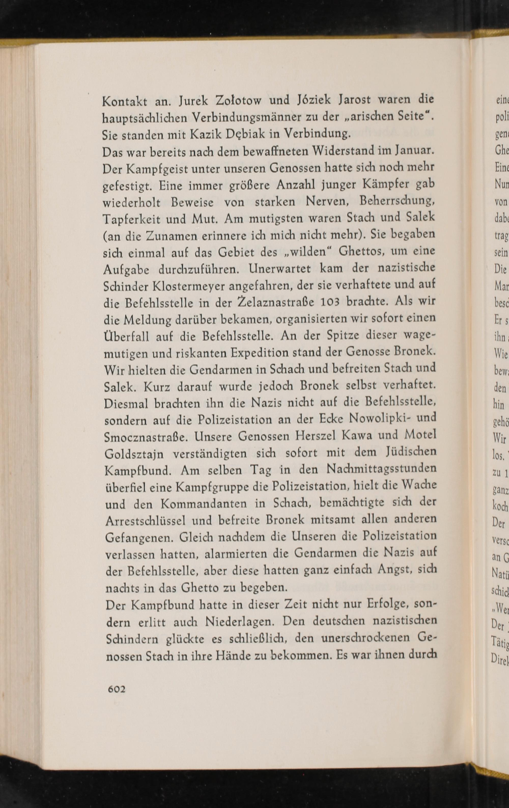Das war bereits nach dem bewaffneten Widerstand im Januar. Der Kampfgeist unter unseren Genossen hatte sich noch mehr gefestigt. Eine immer größere Anzahl junger Kämpfer gab wiederholt Beweise von starken Nerven, Beherrschung, Tapferkeit und Mut. Am mutigsten waren Stach und Salek (an die Zunamen erinnere ich mich nicht mehr). Sie begaben sich einmal auf das Gebiet des„wilden“ Ghettos, um eine Aufgabe durchzuführen. Unerwartet kam der nazistische Schinder Klostermeyer angefahren, der sie verhaftete und auf die Befehlsstelle in der Zelaznastraße 103 brachte. Als wir die Meldung darüber bekamen, organisierten wir sofort einen Überfall auf die Befehlsstelle. An der Spitze dieser wage- mutigen und riskanten Expedition stand der Genosse Bronek. Wir hielten die Gendarmen in Schach und befreiten Stach und Salek. Kurz darauf wurde jedoch Bronek selbst verhaftet. Diesmal brachten ihn die Nazis nicht auf die Befehlsstelle, sondern auf die Polizeistation an der Ecke Nowolipki- und Smocznastraße. Unsere Genossen Herszel Kawa und Motel Goldsztajn verständigten sich sofort mit dem Jüdischen Kampfbund. Am selben Tag in den Nachmittagsstunden überfiel eine Kampfgruppe die Polizeistation, hielt die Wache und den Kommandanten in Schach, bemächtigte sich der Arrestschlüssel und befreite Bronek mitsamt allen anderen Gefangenen. Gleich nachdem die Unseren die Polizeistation verlassen hatten, alarmierten die Gendarmen die Nazis auf der Befehlsstelle, aber diese hatten ganz einfach Angst, sich nachts in das Ghetto zu begeben.