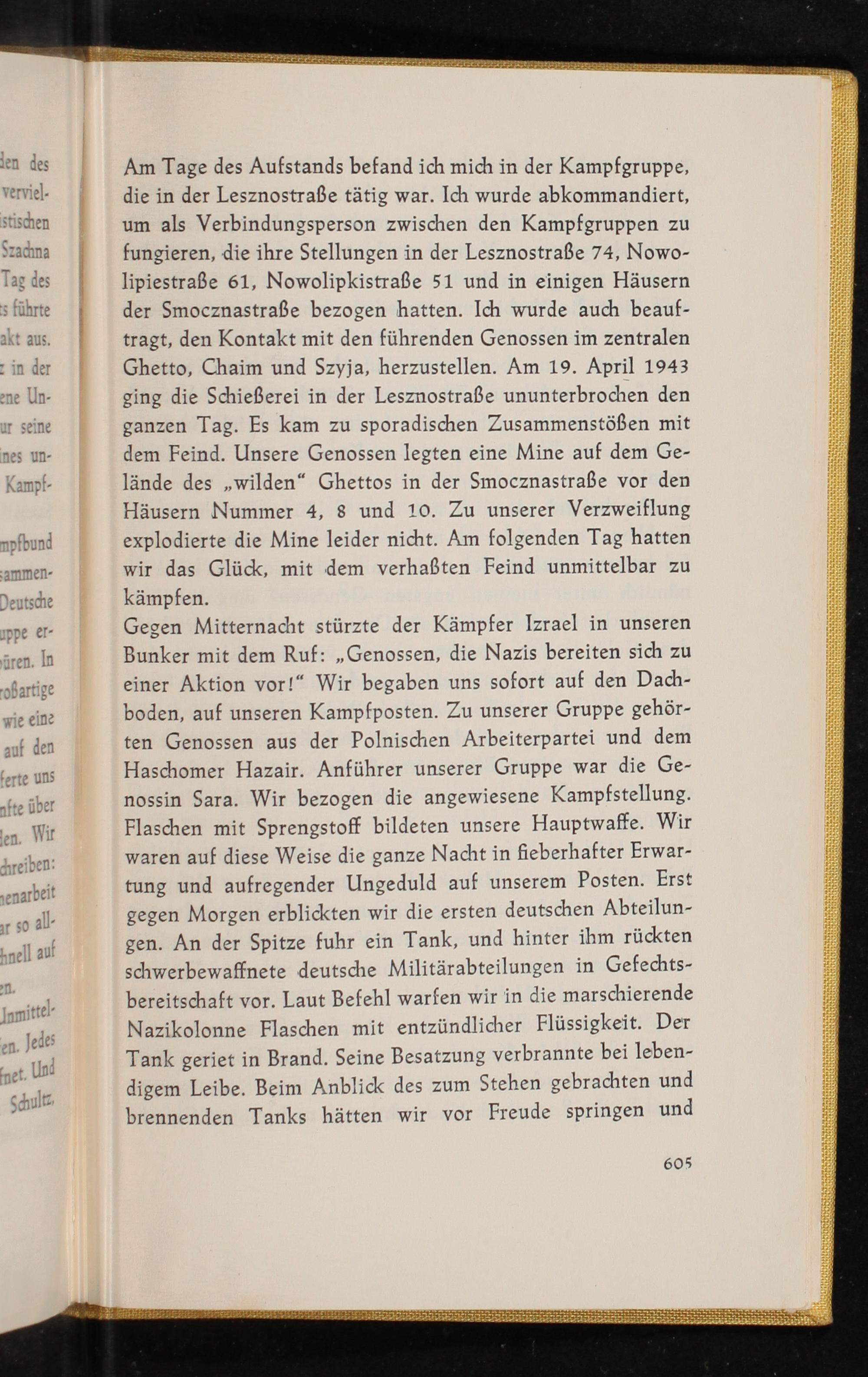 Am Tage des Aufstands befand ich mich in der Kampfgruppe, die in der Lesznostraße tätig war. Ich wurde abkommandiert, um als Verbindungsperson zwischen den Kampfgruppen zu fungieren, die ihre Stellungen in der Lesznostraße 74, Nowo- lipiestraße 61, Nowolipkistraße 51 und in einigen Häusern der Smocznastraße bezogen hatten. Ich wurde auch beauf- tragt, den Kontakt mit den führenden Genossen im zentralen Ghetto, Chaim und Szyja, herzustellen. Am 19. April 1943 ging die Schießerei in der Lesznostraße ununterbrochen den ganzen Tag. Es kam zu sporadischen Zusammenstößen mit dem Feind. Unsere Genossen legten eine Mine auf dem Ge- lände des„wilden“ Ghettos in der Smocznastraße vor den Häusern Nummer 4, 8 und 10. Zu unserer Verzweiflung explodierte die Mine leider nicht. Am folgenden Tag hatten wir das Glück, mit dem verhaßten Feind unmittelbar zu kämpfen.