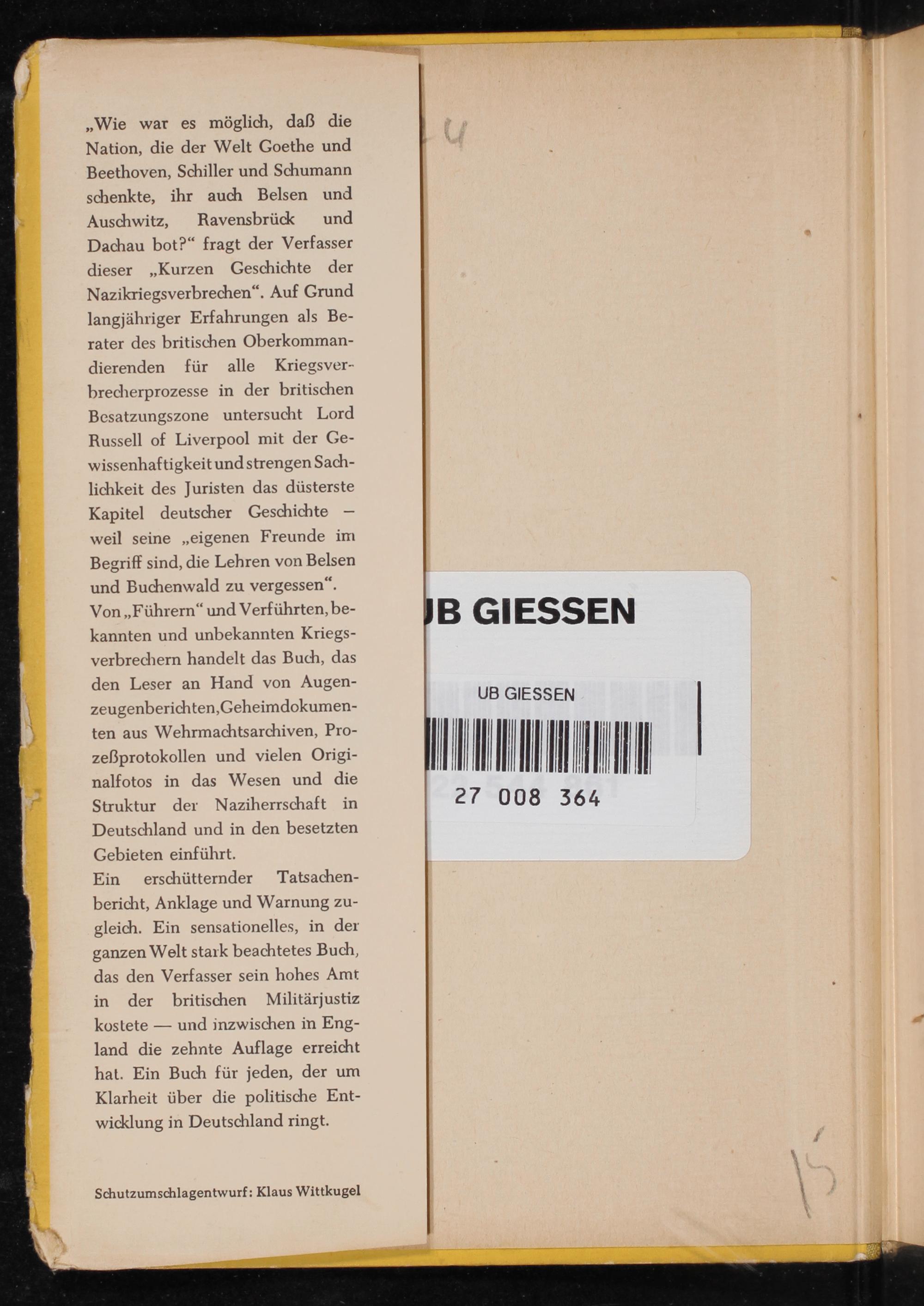 „Wie war es möglich, daß die Nation, die der Welt Goethe und Beethoven, Schiller und Schumann schenkte, ihr auch Belsen und Auschwitz, Ravensbrück und Dachau bot?“ fragt der Verfasser dieser„Kurzen Geschichte der Nazikriegsverbrechen“. Auf Grund langjähriger Erfahrungen als Be- rater des britischen Oberkomman- dierenden für alle Kriegsver- brecherprozesse in der britischen Besatzungszone untersucht Lord Russell of Liverpool mit der Ge- wissenhaftigkeitund strengen Sach- lichkeit des Juristen das düsterste Kapitel deutscher Geschichte— weil seine„eigenen Freunde im Begriff sind, die Lehren von Belsen und Buchenwald zu vergessen“. Von„Führern“ und Verführten, be- kannten und unbekannten Kriegs- verbrechern handelt das Buch, das den Leser an Hand von Augen- zeugenberichten,Geheimdokumen- ten aus Wehrmachtsarchiven, Pro- zeßprotokollen und vielen Origi- nalfotos in das Wesen und die Struktur der Naziherrschaft in Deutschland und in den besetzten Gebieten einführt.