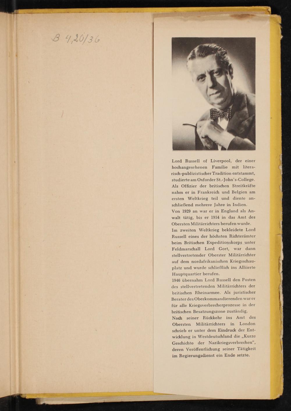 hochangesehenen Familie mit litera- risch-publizistischer Tradition entstammt, studierte am Oxforder St.-John’s-College. Als Offizier der britischen Streitkräfte nahm er in Frankreich und Belgien am ersten Weltkrieg teil und diente an- schließend mehrere Jahre in Indien. Von 1929 an war er in England als An- walt tätig, bis er 1934 in das Amt des Obersten Militärrichters berufen wurde. Im zweiten Weltkrieg bekleidete Lord Russell eines der höchsten Richterämter beim Britischen Expeditionskorps unter Feldmarschall Lord Gort, war dann stellvertretender Oberster Militärrichter auf dem nordafrikanischen Kriegsschau- platz und wurde schließlich ins Alliierte Hauptquartier berufen.