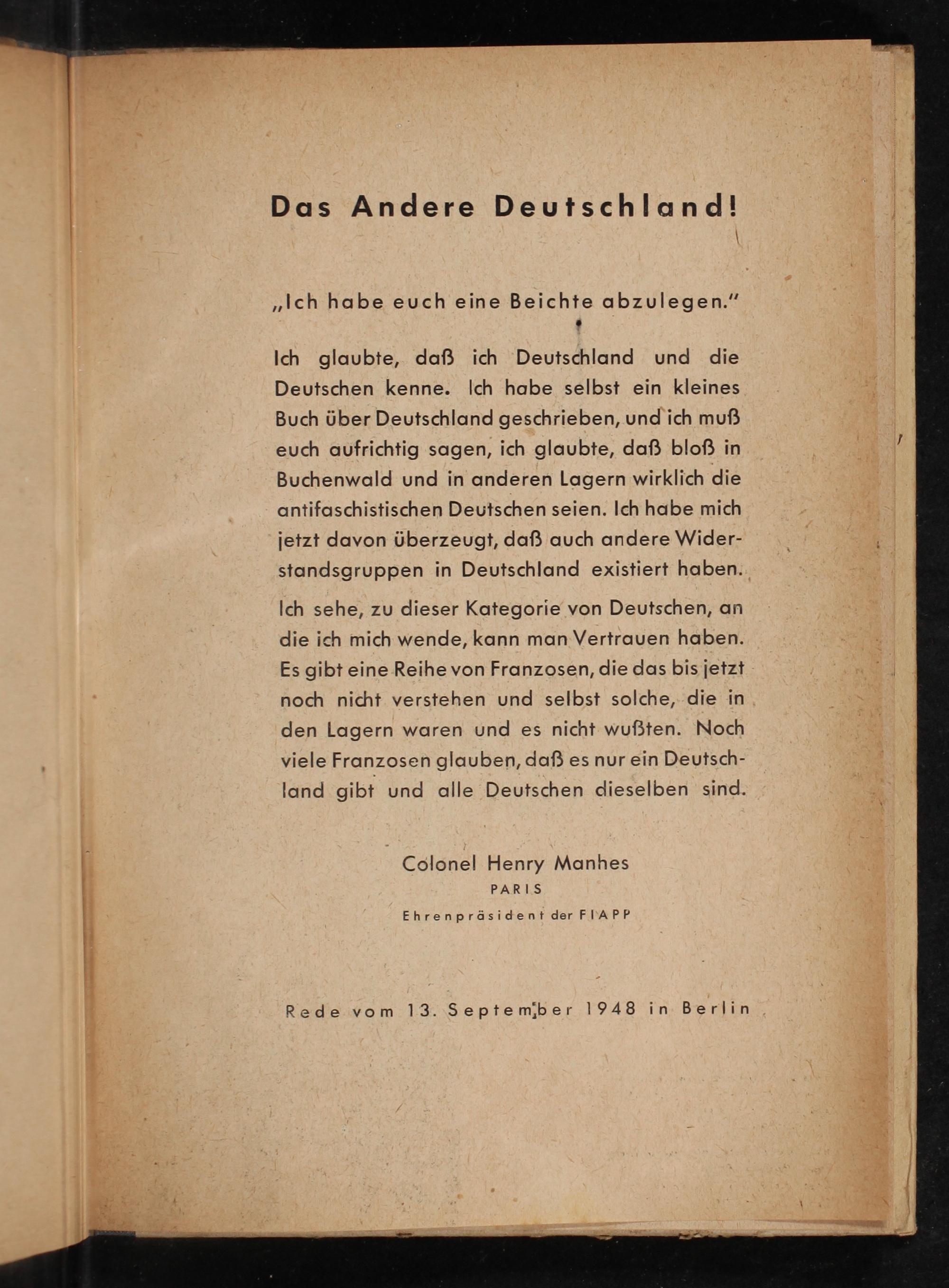 Ich glaubte, daß ich Deutschland und die Deutschen kenne. Ich habe selbst ein kleines Buch über Deutschland geschrieben, und ich muß euch aufrichtig sagen, ich glaubte, daß bloß in Buchenwald und in anderen Lagern wirklich die antifaschistischen Deutschen seien. Ich habe mich jetzt davon überzeugt, daß auch andere Wider-