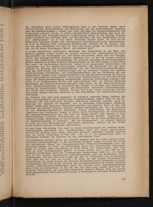In einem gleichzeitig verbreiteten Merkblatt, das tausendfach an die West- und Ostfront gesandt wurde, fordert der Berliner Ausschuß des ‚„Nationalkomitee Freies Deuischland‘’ die Frontiruppen auf, den Kampf einzustellen. Wenn man der Anklage- schritt des Volksgerichtshofes Glauben schenken aarf, so hat die Gruppe Saefkow bereits 1943 langwierige Verhandlungen mit anderen deutschen Widerstandsgruppen geführt. Namentlich werden aufgeführt Besprechungen mit der SPD-Gruppe von Reichweın und Leber, mit katholischen Geistlichen, fortschiiitlich gesonnenen Industriellen und Ingenieuren und mit Oppositionsgruppen innerhalb der Wehrmacht und des M.ni- steriums für Rüstung und Kriegsproduklion. Von der Wehrmacht-Propaganda-Ablei- lung des OKW e.hielt die Saefkow-Gruppe das bei alliierten Truppen und Agenten beschlagnahmie Informations- und Propagandamaterial. Bei der Verhaftung der drei Angeklagien wurden ferner Geheimdokumenie aus dem Reichsministerium für Rüstung und Kriegsproduktion sichergestellt; durch einen Vertrauensmann aus dem Ministerium Speer der Widerstandsbewegung ausgehändigt. Bisherige Ermittlungen ergaben, daß allein in 22 Großbetrieben Berlins und einer größeren Zahl von Werken Hamburgs Beauftragte der Saefkow-Widerstandsgruppe tätig waren, um die Nationalsozialisten durch Produktionssenkung zur Einstellung des Krieges zu zwingen. Die Produktions- zeniren für neueniwickeite Flugzeug- und Panzertypen, technische Schlüsselbetriebe, wie Osram und Telefunken, Siemens, Heinkel und Argus, ferner Hamburger Werften und einige andere Betriebe gehörten zu den Stützpunkten der Saefkow-Untergrund- bewegung.