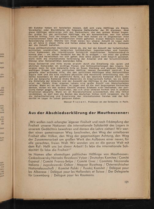 Im Namen aller ehemaligen politischen Häftlinge von Mauthausen: .Ceskoslovensky Närodni Revolucni Vybor/ Deutsches Komitee/ Comite Espanol/ Comit& Franco-Belge/ Comite Grec/ Comitato Nazionale Italiano/ Jugoslovenski Odbor/ Magyar Bizottsag/ Österreichischer Nationalausschuß/ Komitet Polski/ Russkij Komitet/ Delegue pour les Albanese/ Delegue pour les Hollandais et Suisse/ Der Delegierte für Luxemburg/ Delegue pour les Roumains.