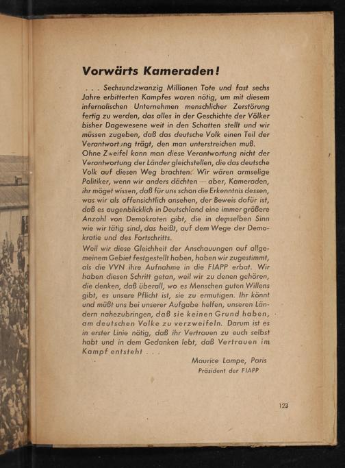 Weil wir diese Gleichheit der Anschauungen auf allge- meinem Gebiet festgestellt haben, haben wir zugestimmt, als die VVN ihre Aufnahme in die FIAPP erbat. Wir haben diesen Schritt getan, weil wir zu denen gehören, die denken, daß überall, wo es Menschen guten Willens gibt, es unsere Pflicht ist, sie zu ermutigen. Ihr könnt und müßt uns bei unserer Aufgabe helfen, unseren Län- dern nahezubringen, daß sie keinen Grund haben, am deutschen Volke zu verzweifeln. Darum ist es in erster Linie nötig, daß ihr Vertrauen zu euch selbst habt und in dem Gedanken lebt, daß Vertrauen im Kampf entsteht.....