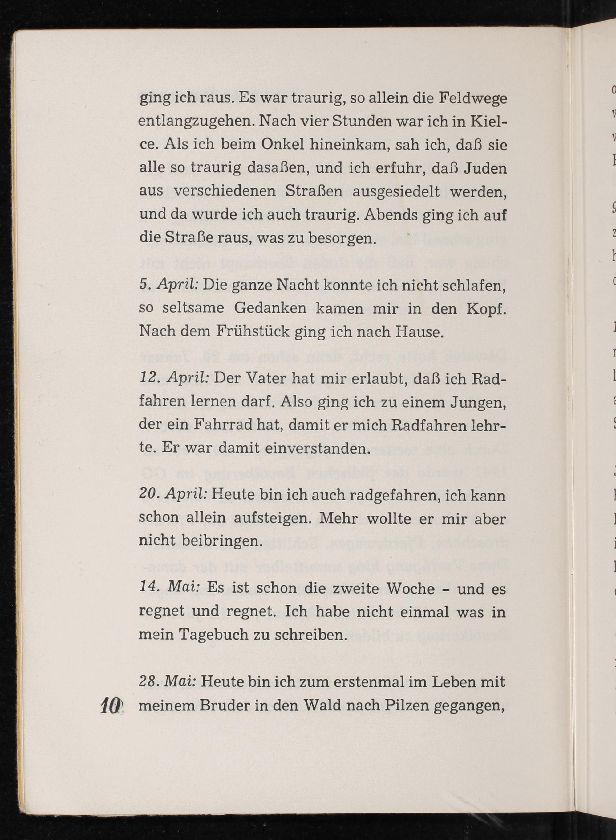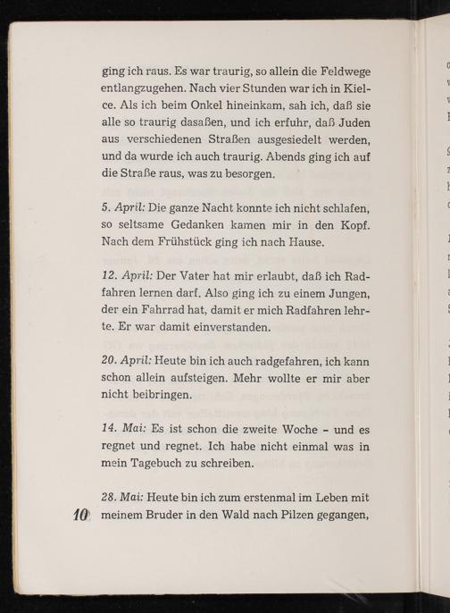 12. April: Der Vater hat mir erlaubt, daß ich Rad- fahren lernen darf. Also ging ich zu einem Jungen, der ein Fahrrad hat, damit er mich Radfahren lehr- te. Er war damit einverstanden.