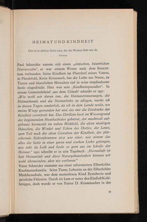 Paul Schneider nannte sich einen„einfachen, bäuerlichen Pfarrerssohn“, er war seinem Wesen nach dem Bauern- tum verbunden. Seine Kindheit im Pfarrdorf seines Vaters, in Pferdsfeld, Kreis Kreuznach, hat die Liebe zur Natur, zu Tieren und bäuerlichen Menschen tief in seine empfindsame Seele eingedrückt. Hier war sein„Kindheitsparadies“. In einem Gemeindebrief ‚aus dem Urlaub‘ schreibt er 1931: „Wie wohl wir daran tun, die Heimaterinnerungen, die Heimatkunde und die Heimatliebe zu pflegen, merke ich in diesen Tagen sonderlich, da ich in dem Lande weile, wo meine Wiege gestanden hat und das mir die Eindrücke der Kindheit vermittelt hat. Das Dörflein hoch im Wiesengrund des beginnenden Hoxtbachtales gebettet, der machtvoll auf- gebaute Soonwald im nahen Blickfeld, die alten niedrigen Häuschen, die Winkel und Ecken des Dorfes, die Leute, zum Teil noch die alten Gestalten der Kindheit, der plät- schernde Röhrenbrunnen jetzt wie einst: wie nimmt das alles die Seele in einer guten und starken Liebe gefangen, wie ruht da Leib und Seele so gern aus im Schoße der Heimat.“ 1925 schreibt er in sein Tagebuch:„Heimatluft ist balt Heimatluft und diese Naturgebundenheit können wir wohl überwinden, aber nie verlieren.“