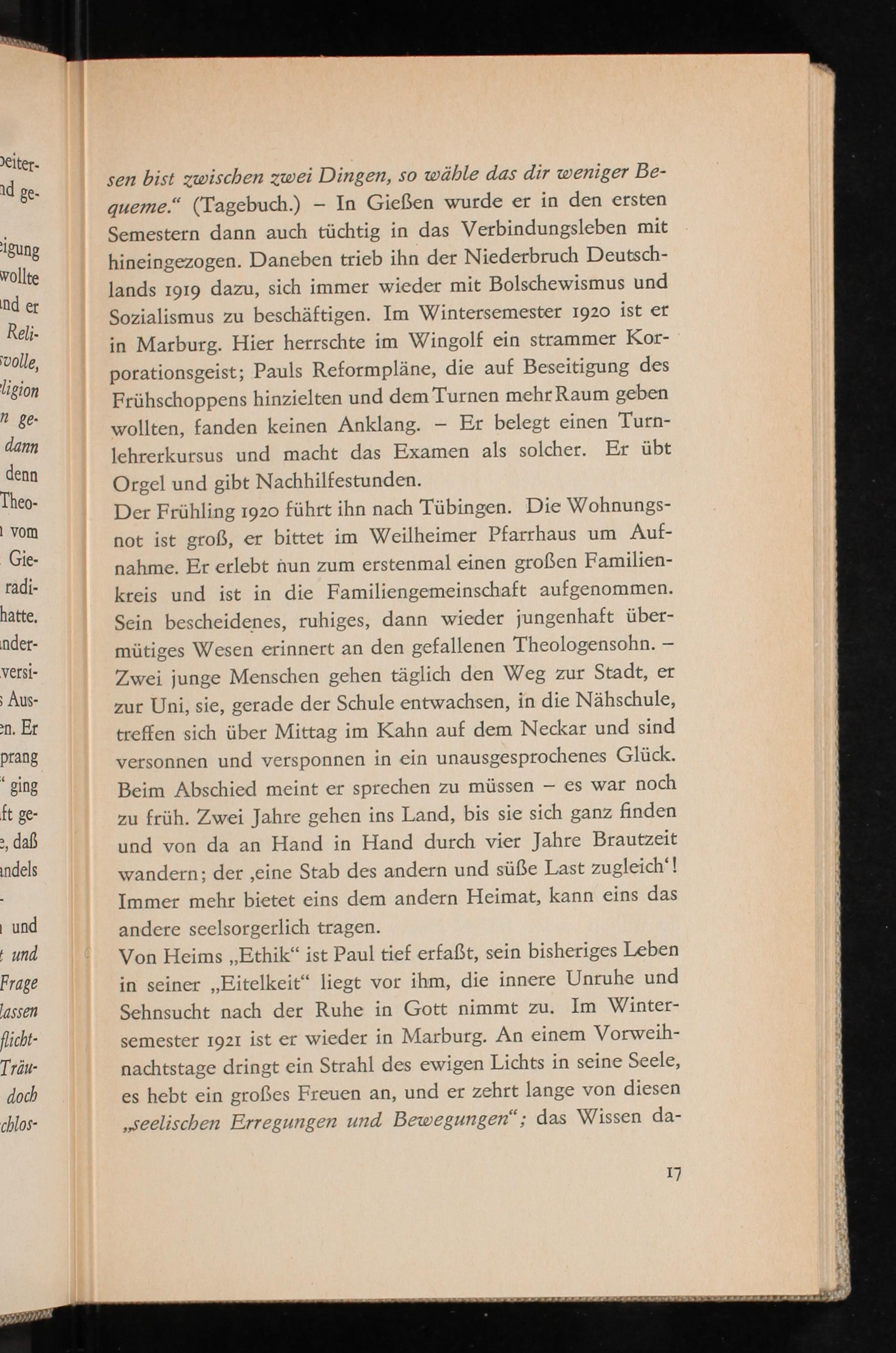 Von Heims„Ethik“ ist Paul tief erfaßt, sein bisheriges Leben in seiner„Eitelkeit“ liegt vor ihm, die innere Unruhe und Sehnsucht nach der Ruhe in Gott nimmt zu. Im Winter- semester 1921 ist er wieder in Marburg. An einem Vorweih- nachtstage dringt ein Strahl des ewigen Lichts in seine Seele, es hebt ein großes Freuen an, und er zehrt lange von diesen „seelischen Erregungen und Bewegungen“; das Wissen da-