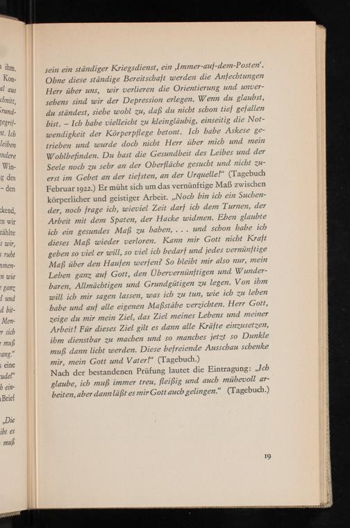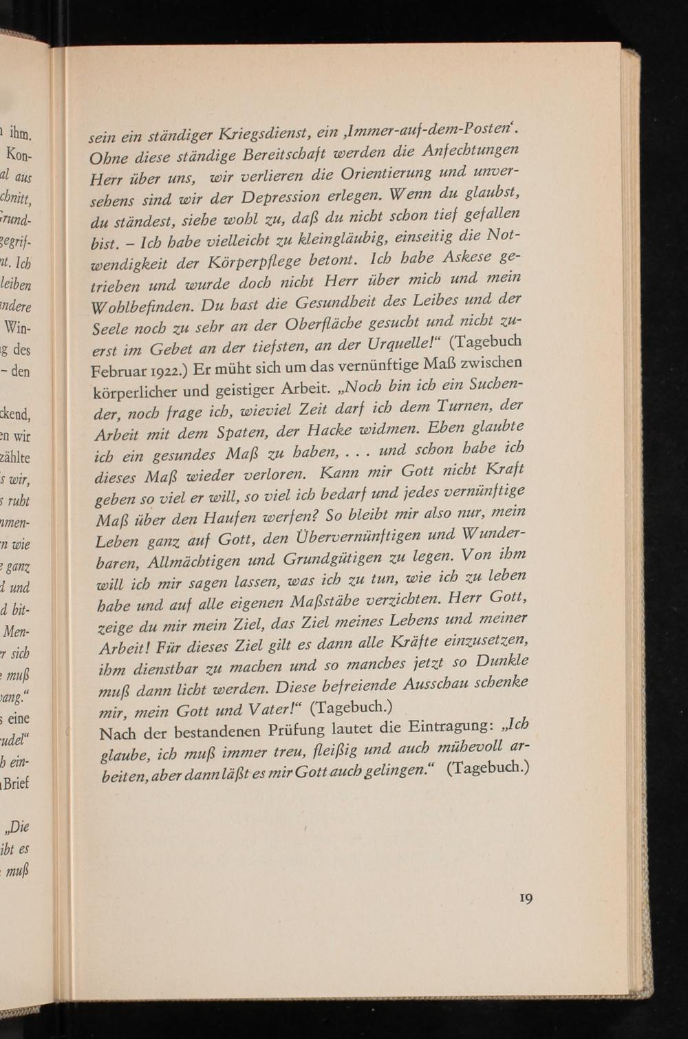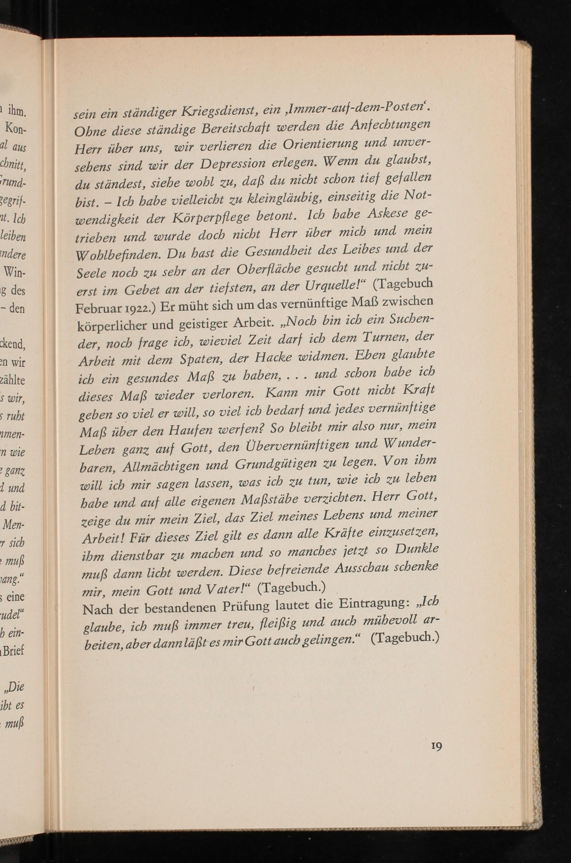 sein ein ständiger Kriegsdienst, ein ‚Immer-auf-dem-Posten‘. Ohne diese ständige Bereitschaft werden die Anfechtungen Herr über uns, wir verlieren die Orientierung und unver- sehens sind wir der Depression erlegen. Wenn du glaubst, du ständest, siebe wohl zu, daß du nicht schon tief gefallen bist.- Ich babe vielleicht zu kleingläubig, einseitig die Not- wendigkeit der Körperpflege betont. Ich habe Askese ge- trieben und wurde doch nicht Herr über mich und mein Wohlbefinden. Du hast die Gesundheit des Leibes und der Seele noch zu sehr an der Oberfläche gesucht und nicht zu- erst im Gebet an der tiefsten, an der Urquelle!“(Tagebuch Februar 1922.) Er müht sich um das vernünftige Maß zwischen körperlicher und geistiger Arbeit.„Noch bin ich ein Suchen- der, noch frage ich, wieviel Zeit darf ich dem Turnen, der Arbeit mit dem Spaten, der Hacke widmen. Eben glaubte ich ein gesundes Maß zu haben,... und schon habe ich dieses Maß wieder verloren. Kann mir Gott nicht Kraft geben so viel er will, so viel ich bedarf und jedes vernünftige Maß über den Haufen werfen? So bleibt mir also nur, mein Leben ganz auf Gott, den Übervernünftigen und Wunder- baren, Allmächtigen und Grundgütigen zu legen. Von ihm will ich mir sagen lassen, was ich zu tun, wie ich zu leben habe und auf alle eigenen Maßstäbe verzichten. Herr Gott, zeige du mir mein Ziel, das Ziel meines Lebens und meiner Arbeit! Für dieses Ziel gilt es dann alle Kräfte einzusetzen, ibm dienstbar zu machen und so manches jetzt so Dunkle muß dann licht werden. Diese befreiende Ausschau schenke mir, mein Gott und Vater!“(Tagebuch.)