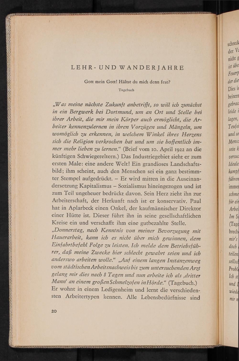 „Was meine nächste Zukunft anbetrifft, so will ich zunächst in ein Bergwerk bei Dortmund, um an Ort und Stelle bei ihrer Arbeit, die mir mein Körper auch ermöglicht, die Ar- beiter kennenzulernen in ihren Vorzügen und Mängeln, um womöglich zu erkennen, in welchem Winkel ihres Herzens sich die Religion verkrochen hat und um sie hoffentlich im- mer mehr lieben zu lernen.“(Brief vom 10. April 1922 an die künftigen Schwiegereltern.) Das Industriegebiet sieht er zum ersten Male: eine andere Welt! Ein grandioses Landschafts- bild; ihm scheint, auch den Menschen sei ein ganz bestimm- ter Stempel aufgedrückt.- Er wird mitten in die Auseinan- dersetzung Kapitalismus— Sozialismus hineingezogen und ist zum Teil ungeheuer bedrückt davon. Sein Herz zieht ihn zur Arbeiterschaft, der Herkunft nach ist er konservativ. Paul hat in Aplarbeck einen Onkel, der kaufmännischer Direktor einer Hütte ist. Dieser führt ihn in seine gesellschaftlichen Kreise ein und verschafft ihm eine gutbezahlte Stelle. „Donnerstag, nach Kenntnis von meiner Bevorzugung mit Hauerarbeit, kann ich es nicht über mich gewinnen, dem Einfahrtbefehl Folge zu leisten. Ich melde dem Betriebsfüh- rer, daß meine Zwecke hier schlecht gewahrt seien und ich anderswo arbeiten wolle“„Auf einem langen Instanzenweg vom städtischen Arbeitsnachweisbis zum untersuchenden Arzt gelang mir dies nach 8 Tagen und nun arbeite ich als ‚dritter Mann‘ an einem großenSchmelzofen inHörde“(Tagebuch.) Er wohnt in einem Ledigenheim und lernt die verschieden- sten Arbeitertypen kennen. Alle Lebensbedürfnisse sind