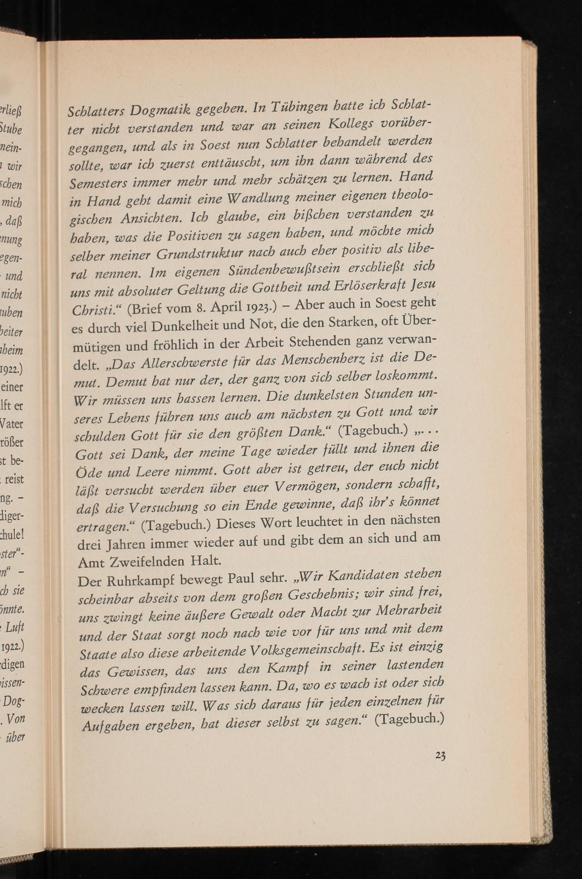 Schlatters Dogmatik gegeben. In Tübingen hatte ich Schlat- ter nicht verstanden und war an seinen Kollegs vorüber- gegangen, und als in Soest nun Schlatter behandelt werden sollte, war ich zuerst enttäuscht, um ihn dann während des Semesters immer mehr und mehr schätzen zu lernen. Hand in Hand geht damit eine Wandlung meiner eigenen theolo- gischen Ansichten. Ich glaube, ein bißchen verstanden zu haben, was die Positiven zu sagen haben, und möchte mich selber meiner Grundstruktur nach auch eber positiv als libe- al nennen. Im eigenen Sündenbewußtsein erschließt sich uns mit absoluter Geltung die Gottheit und Erlöserkraft Jesu Christi.“(Brief vom 8. April 1923.)— Aber auch in Soest geht es durch viel Dunkelheit und Not, die den Starken, oft Über- mütigen und fröhlich in der Arbeit Stehenden ganz verwan- delt.„Das Allerschwerste für das Menschenberz ist die De- mut. Demut hat nur der, der ganz von sich selber loskommt. Wir müssen uns hassen lernen. Die dunkelsten Stunden un- seres Lebens führen uns auch am nächsten zu Gott und wir schulden Gott für sie den größten Dank.“(Tagebuch.)„...- Gott sei Dank, der meine Tage wieder füllt und ihnen die Öde und Leere nimmt. Gott aber ist getreu, der euch nicht läßt versucht werden über euer Vermögen, sondern schafft, daß die Versuchung so ein Ende gewinne, daß ihr’s könnet ertragen.“(Tagebuch.) Dieses Wort leuchtet in den nächsten drei Jahren immer wieder auf und gibt dem an sich und am Amt Zweifelnden Halt.