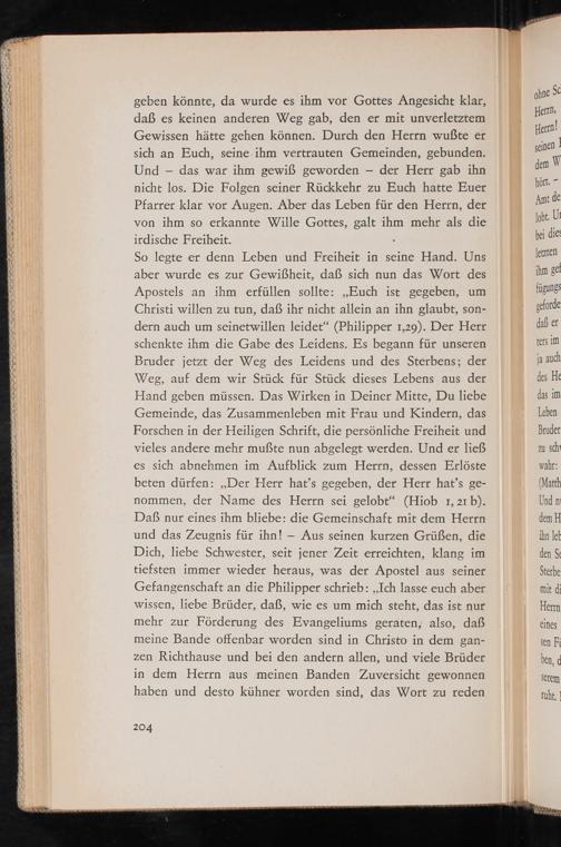 geben könnte, da wurde es ihm vor Gottes Angesicht klar, daß es keinen anderen Weg gab, den er mit unverletztem Gewissen hätte gehen können. Durch den Herrn wußte er sich an Euch, seine ihm vertrauten Gemeinden, gebunden. Und- das war ihm gewiß geworden— der Herr gab ihn nicht los. Die Folgen seiner Rückkehr zu Euch hatte Euer Pfarrer klar vor Augen. Aber das Leben für den Herrn, der von ihm so erkannte Wille Gottes, galt ihm mehr als die irdische Freiheit. So legte er denn Leben und Freiheit in seine Hand. Uns aber wurde es zur Gewißheit, daß sich nun das Wort des Apostels an ihm erfüllen sollte:„Euch ist gegeben, um Christi willen zu tun, daß ihr nicht allein an ihn glaubt, son- dern auch um seinetwillen leidet“(Philipper 1,29). Der Herr schenkte ihm die Gabe des Leidens. Es begann für unseren Bruder jetzt der Weg des Leidens und des Sterbens; der Weg, auf dem wir Stück für Stück dieses Lebens aus der Hand geben müssen. Das Wirken in Deiner Mitte, Du liebe Gemeinde, das Zusammenleben mit Frau und Kindern, das Forschen in der Heiligen Schrift, die persönliche Freiheit und vieles andere mehr mußte nun abgelegt werden. Und er ließ es sich abnehmen im Aufblick zum Herrn, dessen Erlöste beten dürfen:„Der Herr hat’s gegeben, der Herr hat’s ge- nommen, der Name des Herrn sei gelobt“(Hiob 1, 2rb). Daß nur eines ihm bliebe: die Gemeinschaft mit dem Herrn und das Zeugnis für ihn!— Aus seinen kurzen Grüßen, die Dich, liebe Schwester, seit jener Zeit erreichten, klang im tiefsten immer wieder heraus, was der Apostel aus seiner Gefangenschaft an die Philipper schrieb:„Ich lasse euch aber wissen, liebe Brüder, daß, wie es um mich steht, das ist nur mehr zur Förderung des Evangeliums geraten, also, daß meine Bande offenbar worden sind in Christo in dem gan- zen Richthause und bei den andern allen, und viele Brüder in dem Herrn aus meinen Banden Zuversicht gewonnen haben und desto kühner worden sind, das Wort zu reden