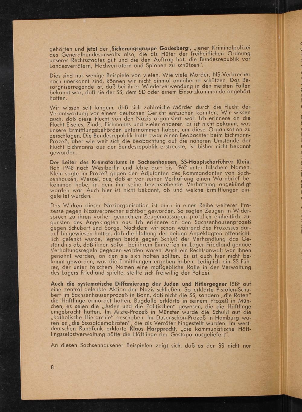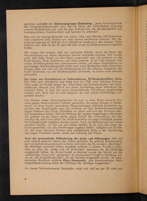 Dies sind nur wenige Beispiele von vielen. Wie viele Mörder, NS-Verbrecher noch unerkannt sind, können wir nicht einmal annähernd schätzen. Das Be- sorgniserregende ist, daß bei ihrer Wiederverwendung in den meisten Fällen bekannt war, daß sie der SS, dem SD oder einem Einsotzkommando angehört hatten..