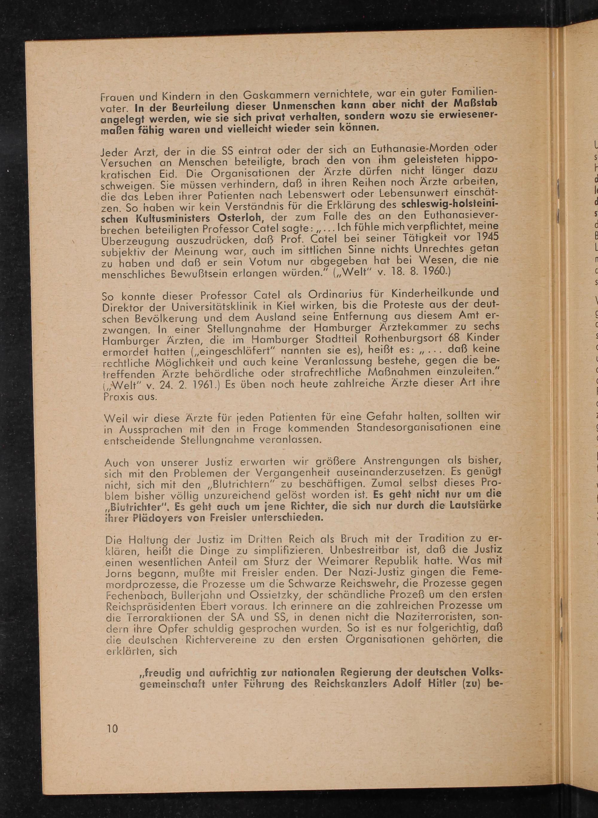 Jeder Arzt, der in die SS eintrat oder der sich an Euthanasie-Morden oder Versuchen an Menschen beteiligte, brach den von ihm geleisteten hippo- kratischen Eid. Die Organisationen der Ärzte dürfen nicht länger dazu schweigen. Sie müssen verhindern, daß in ihren Reihen noch Ärzte arbeiten, die das Leben ihrer Patienten nach Lebenswert oder Lebensunwert einschät- zen. So haben wir kein Verständnis für die Erklärung des schleswig-holsteini- schen Kultusministers Osterloh, der zum Falle des an den Euthanasiever- brechen beteiligten Professor Catel sagte:„...Ich fühle mich verpflichtet, meine Überzeugung auszudrücken, daß Prof. Catel bei seiner Tätigkeit vor 1945 subjektiv der Meinung war, auch im sittlichen Sinne nichts Unrechtes getan zu haben und daß er sein Votum nur abgegeben hat bei Wesen, die nie menschliches Bewußtsein erlangen würden.”(„Welt“ v. 18. 8. 1960.)