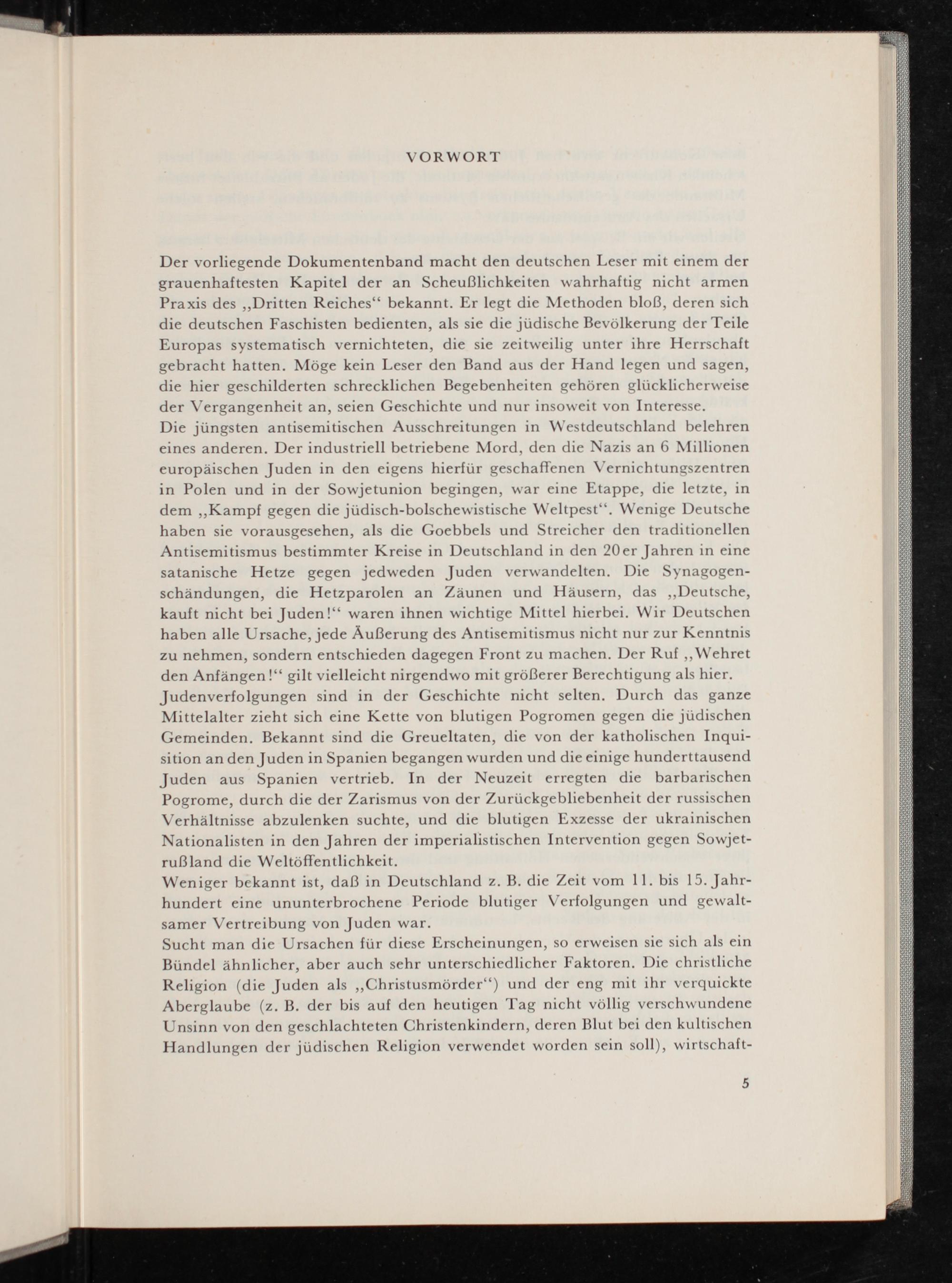 Der vorliegende Dokumentenband macht den deutschen Leser mit einem der grauenhaftesten Kapitel der an Scheußlichkeiten wahrhaftig nicht armen Praxis des ‚Dritten Reiches‘ bekannt. Er legt die Methoden bloß, deren sich die deutschen Faschisten bedienten, als sie die jüdische Bevölkerung der Teile Europas systematisch vernichteten, die sie zeitweilig unter ihre Herrschaft gebracht hatten. Möge kein Leser den Band aus der Hand legen und sagen, die hier geschilderten schrecklichen Begebenheiten gehören glücklicherweise der Vergangenheit an, seien Geschichte und nur insoweit von Interesse.