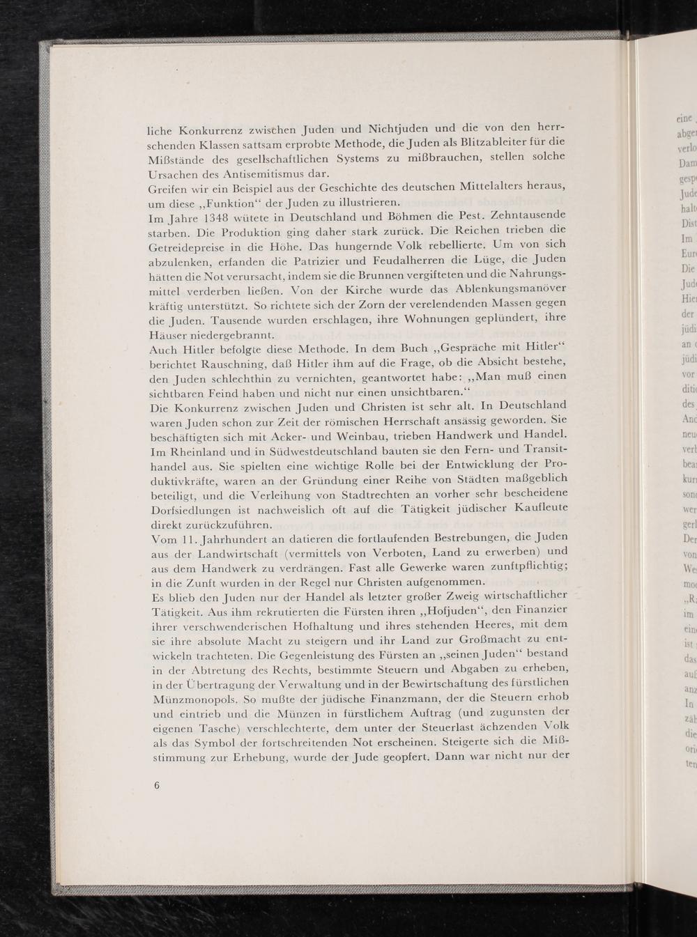 Es blieb den Juden nur der Handel als letzter großer Zweig wirtschaftlicher Tätigkeit. Aus ihm rekrutierten die Fürsten ihren„Hotjuden‘‘, den Finanzier ihrer verschwenderischen Hofhaltung und ihres stehenden Heeres, mit dem sie ihre absolute Macht zu steigern und ihr Land zur Großmacht zu ent- wickeln trachteten. Die Gegenleistung des Fürsten an ‚‚seinen Juden“ bestand in der Abtretung des Rechts, bestimmte Steuern und Abgaben zu erheben, in der Übertragung der Verwaltung und in der Bewirtschaftung des fürstlichen Münzmonopols. So mußte der jüdische Finanzmann, der die Steuern erhob und eintrieb und die Münzen in fürstlichem Auftrag(und zugunsten der eigenen Tasche) verschlechterte, dem unter der Steuerlast ächzenden Volk als das Symbol der fortschreitenden Not erscheinen. Steigerte sich die Miß- stimmung zur Erhebung, wurde der Jude geopfert. Dann war nicht nur der