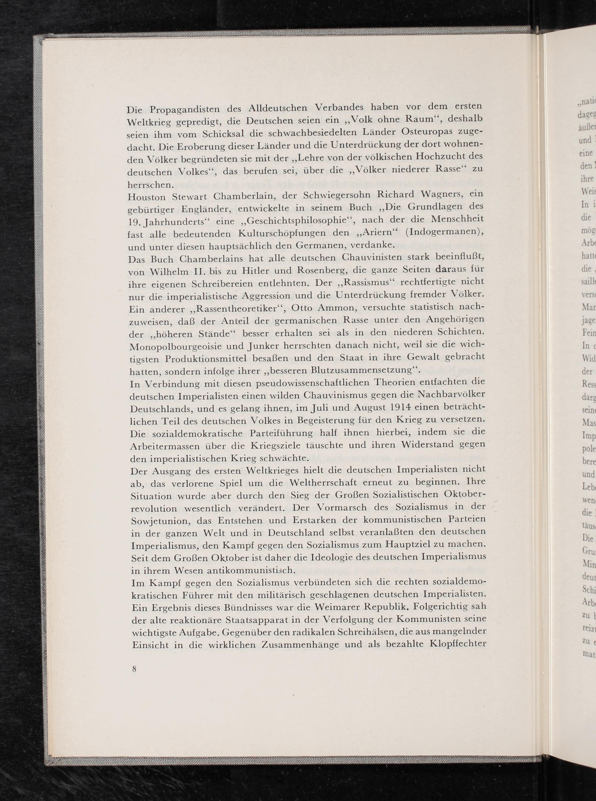 Die Propagandisten des Alldeutschen Verbandes haben vor dem ersten Weltkrieg gepredigt, die Deutschen seien ein„Volk ohne Raum‘, deshalb dageg seien ihm vom Schicksal die schwachbesiedelten Länder Osteuropas zuge- aubei dacht. Die Eroberung dieser Länder und die Unterdrückung der dort wohnen- und den Völker begründeten sie mit der„Lehre von der völkischen Hochzucht des eine deutschen Volkes“, das berufen sei, über die„Völker niederer Rasse‘ zu den’ herrschen. ihre Houston Stewart Chamberlain, der Schwiegersohn Richard Wagners, ein Weis gebürtiger Engländer, entwickelte in seinem Buch„Die Grundlagen des In