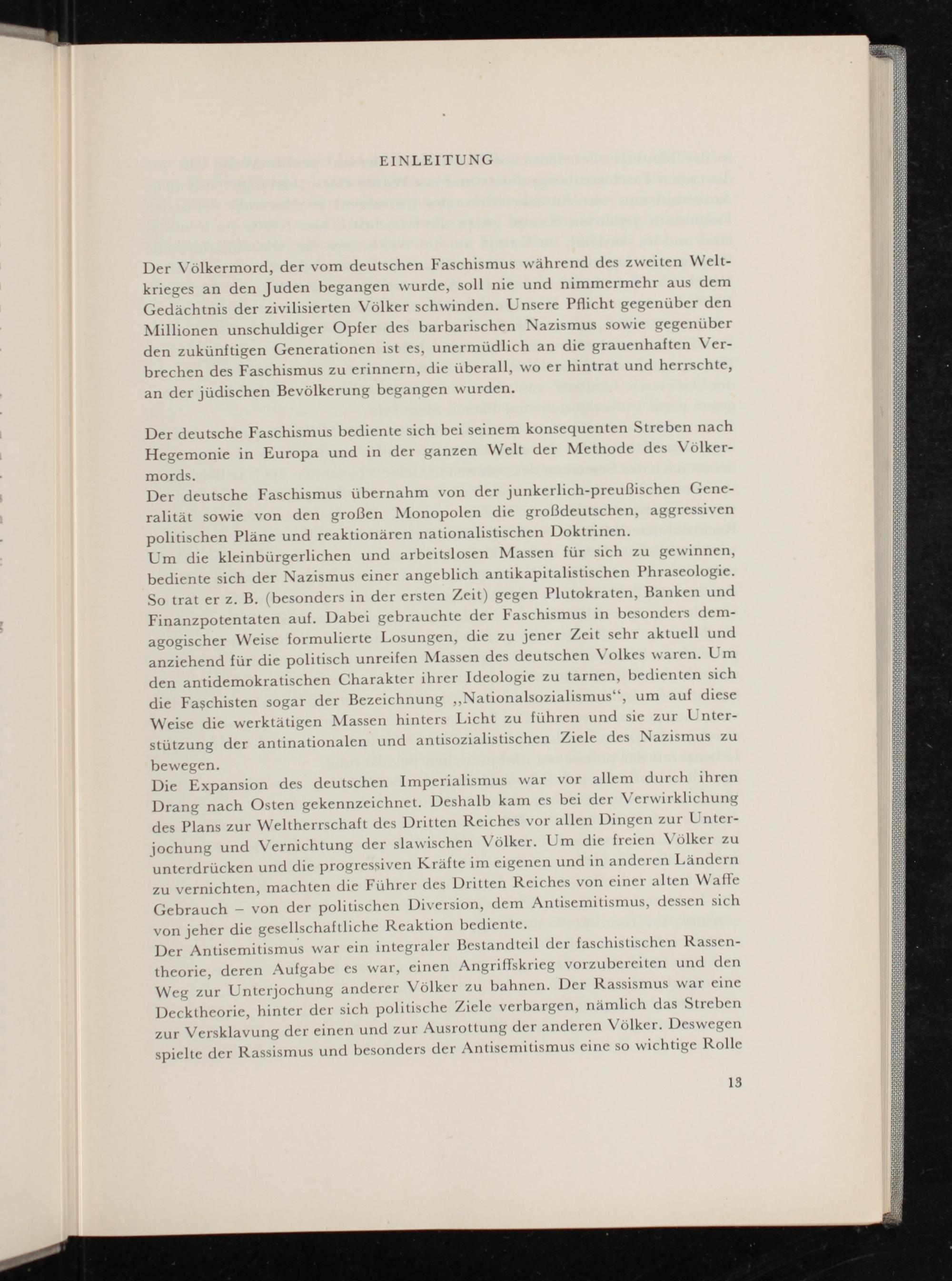 Der Antisemitismus war ein integraler Bestandteil der faschistischen Rassen- theorie, deren Aufgabe es war, einen Angriflskrieg vorzubereiten und den Weg zur Unterjo« hung anderer Völker zu bahnen. Der Rassismus war eine Decktheorie, hinter der sich politisc he Ziele verbargen, nämlich das Streben zur Versklavung der einen und zur Ausrottung der anderen Völker. Deswegen