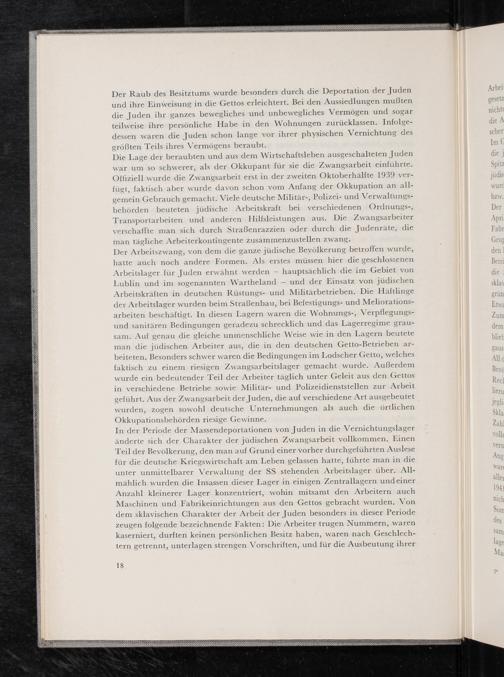 Der Arbeitszwang, von dem die ganze jüdische Bevölkerung betroffen wurde, hatte auch noch andere Formen. Als erstes müssen hier die geschlossenen Arbeitslager für Juden erwähnt werden— hauptsächlich die im Gebiet von Lublin und im sogenannten Wartheland— und der Einsatz von jüdischen Arbeitskräften in deutschen Rüstungs- und Militärbetrieben. Die Häftlinge der Arbeitslager wurden beim Straßenbau, bei Befestigungs- und Meliorations- arbeiten beschäftigt. In diesen Lagern waren die Wohnungs-, Verpflegungs- und sanitären Bedingungen geradezu schrecklich und das Lagerregime grau- sam. Auf genau die gleiche unmenschliche Weise wie in den Lagern beutete man die jüdischen Arbeiter aus, die in den deutschen Getto-Betrieben ar- beiteten. Besonders schwer waren die Bedingungen im Lodscher Getto, welches faktisch zu einem riesigen Zwangsarbeitslager gemacht wurde. Außerdem wurde ein bedeutender Teil der Arbeiter täglich unter Geleit aus den Gettos in verschiedene Betriebe sowie Militär- und Polizeidienststellen zur Arbeit eeführt. Aus der Zwangsarbeit der Juden, die auf verschiedene Art ausgebeutet wurden, zogen sowohl deutsche Unternehmungen als auch die örtlichen Okkupationsbehörden riesige Gewinne.