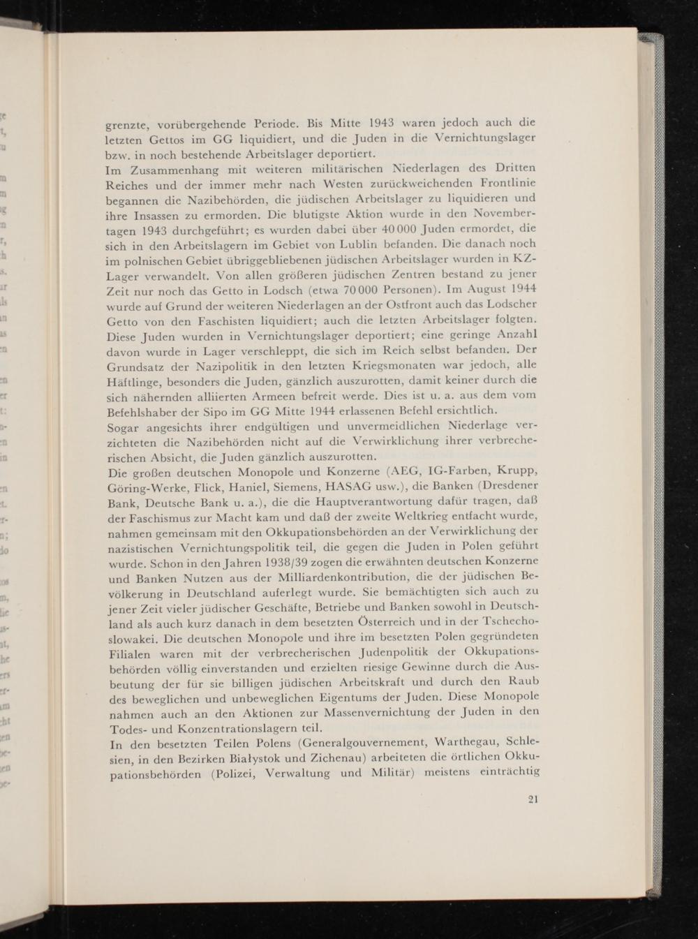 Die großen deutschen Monopole und Konzerne(AEG, IG-Farben, Krupp, Göring-Werke, Flick, Haniel, Siemens, HASAG usw.), die Banken Dresdener Bank, Deutsche Bank u. a.), die die Hauptverantwortung dafür tragen, daß der Faschismus zur Macht kam und daß der zweite Weltkrieg entfacht wurde, nahmen gemeinsam mit den Okkupationsbehörden an der\ erwirklichung der nazistischen Vernichtungspolitik teil, die gegen die Juden in Polen geführt wurde. Schon in den Jahren 1938/39 zogen die erwähnten deutschen Konzerne und Banken Nutzen aus der Milliardenkontribution, die der jüdischen Be- völkerung in Deutschland auferlegt wurde. Sie bemächtigten sich auch zu jener Zeit vieler jüdischer Geschäfte, Betriebe und Banken sowohl in Deutsch- land als auch kurz danach in dem besetzten Österreich und in der Tschecho- slowakei. Die deutschen Monopole und ihre im besetzten Polen gegründeten Filialen waren mit der verbrecherischen Judenpolitik der Okkupations- behörden völlig einverstanden und erzielten riesige Gewinne durch die Aus- beutung der für sie billigen jüdischen Arbeitskraft und durch den Raub des beweglichen und unbeweglichen Eigentums der Juden. Diese Monopole nahmen auch an den Aktionen zur Massenvernichtung der Juden in den Todes- und Konzentrationslagern teil.