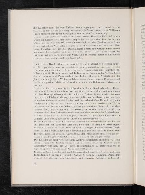 Die in diesem Band enthaltenen Dokumente und Materialien betreffen haupt- sächlich politische und wirtschaftliche Angelegenheiten. Sie sind in vier Hauptgruppen eingeteilt: Deportationen der polnischen und jüdischen Be- völkerung sowie Konzentration und Isolierung der Juden in den Gettos, Raub des Vermögens und Zwangsarbeit der Juden, physische Vernichtung der Juden und die jüdische Widerstandsbewegung. Die erwähnten Probleme sınd in überwiesendem Maße auf Grund von deutschen Dokumenten dargestellt worden.