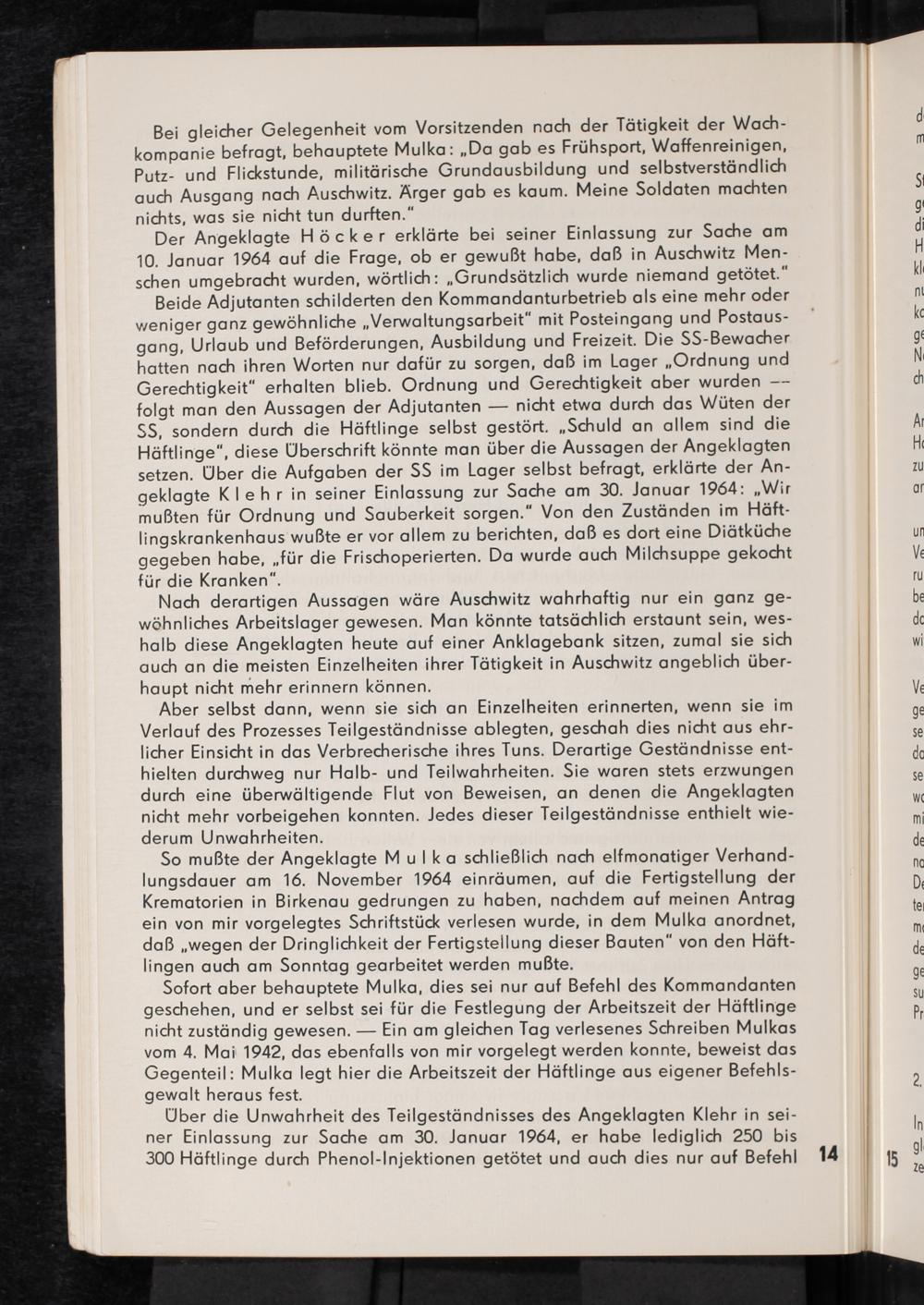Der Angeklagte Höcker erklärte bei seiner Einlassung zur Sache am 10. Januar 1964 auf die Frage, ob er gewußt habe, daß in Auschwitz Men- schen umgebracht wurden, wörtlich:„Grundsätzlich wurde niemand getötet.“